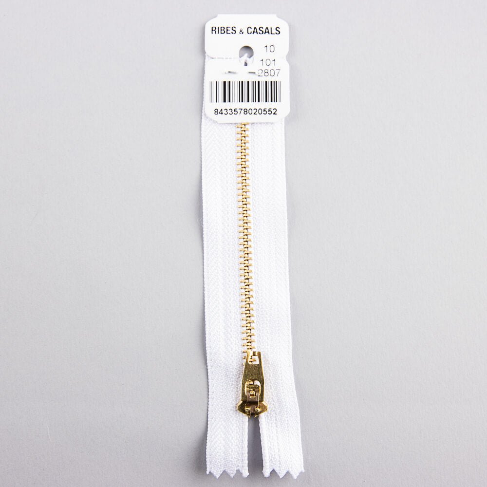 Fermeture éclair à 3 mailles avec des dents en métal doré sur maille blanche. Fermeture à glissière très durable, idéale pour les jeans, les sacs et autres applications où une résistance supplémentaire est nécessaire. Disponible en plusieurs tailles, prix à l'unité.