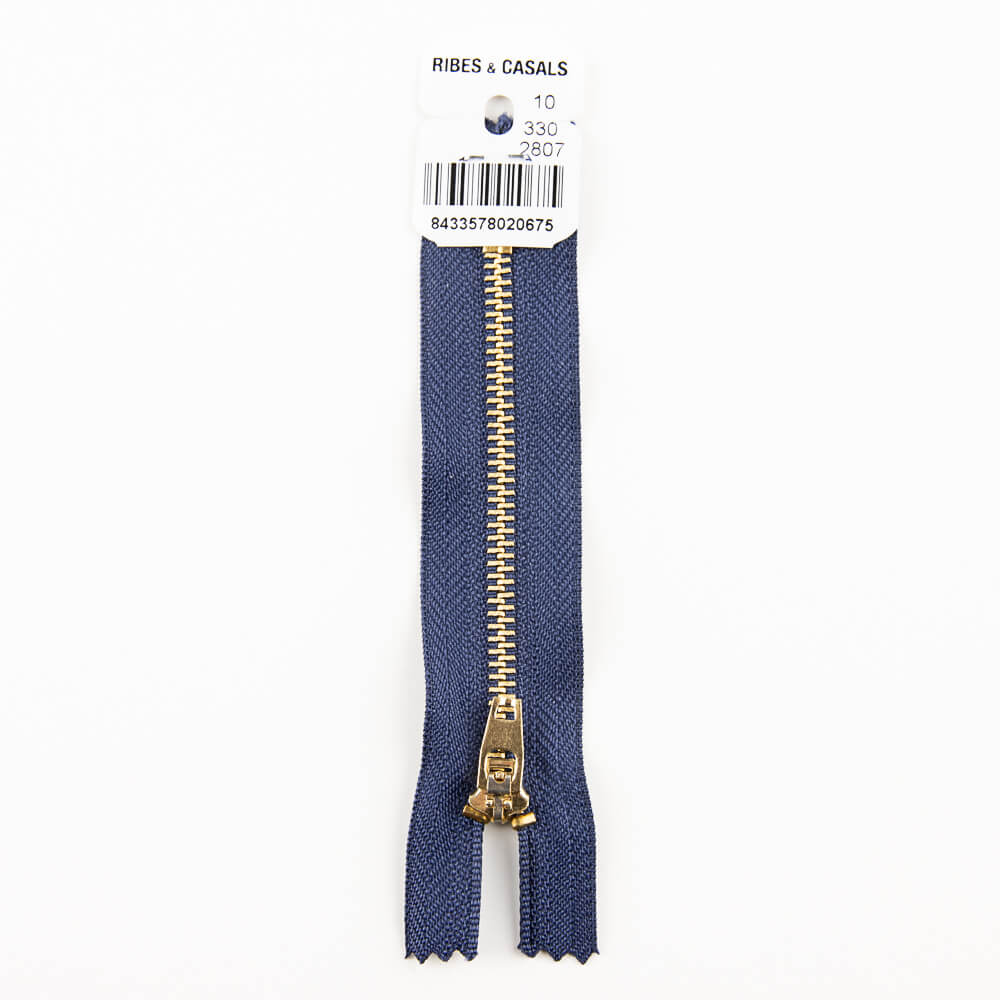 Fermeture à glissière 3 mailles avec dents en métal doré sur maille bleu marine. Fermeture à glissière très durable, idéale pour les jeans, les sacs et autres applications nécessitant une résistance supplémentaire. Disponible en plusieurs tailles, prix à l'unité.