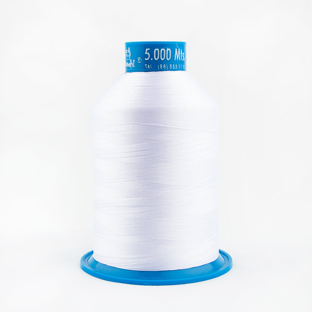 Bobine de fil blanc, idéal pour la broderie, marque Bordafil présentée en chariots de 5000 mètres. Il s'agit d'un fil de polyester brillant fait de filaments continus. Ce fil, en raison de sa préparation technique et de son contrôle, convient aux machines à broder automatiques à grande vitesse.