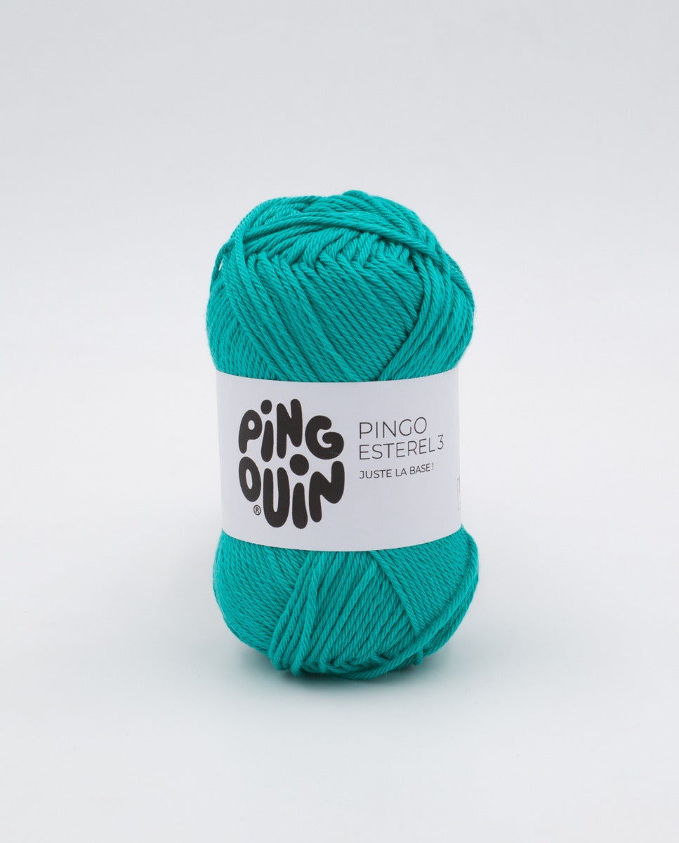 Pelote de laine de la marque Pinguoin collection Esterel de couleur vert émeraude. Fil 100% coton OEKO-TEX, idéal pour tricoter avec des aiguilles ou des crochets. Idéal pour faire des amigurumis. Disponible dans différentes couleurs vives. Pelote de 50 grammes et +/- 105 m. Achetez 14 pelotes pour tricoter un pull taille 42, 8 pelotes pour un pull taille 6 ans, 6 pelotes pour un pull taille 3 mois. Échantillon : 26 mailles x 34 rangs sur les 3 aiguilles. Composition : 100% laine.