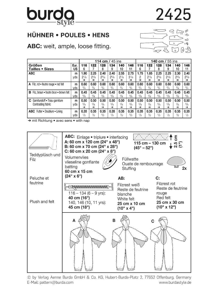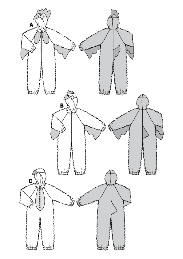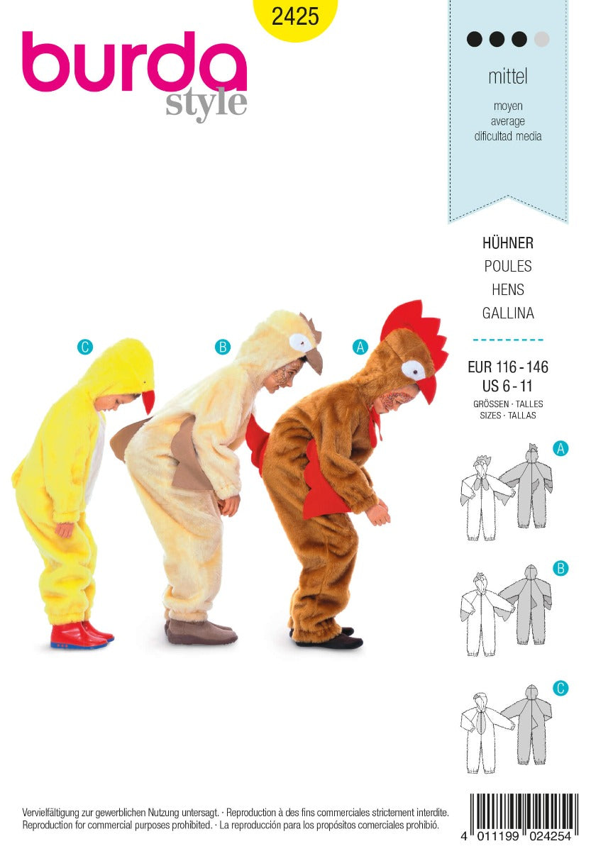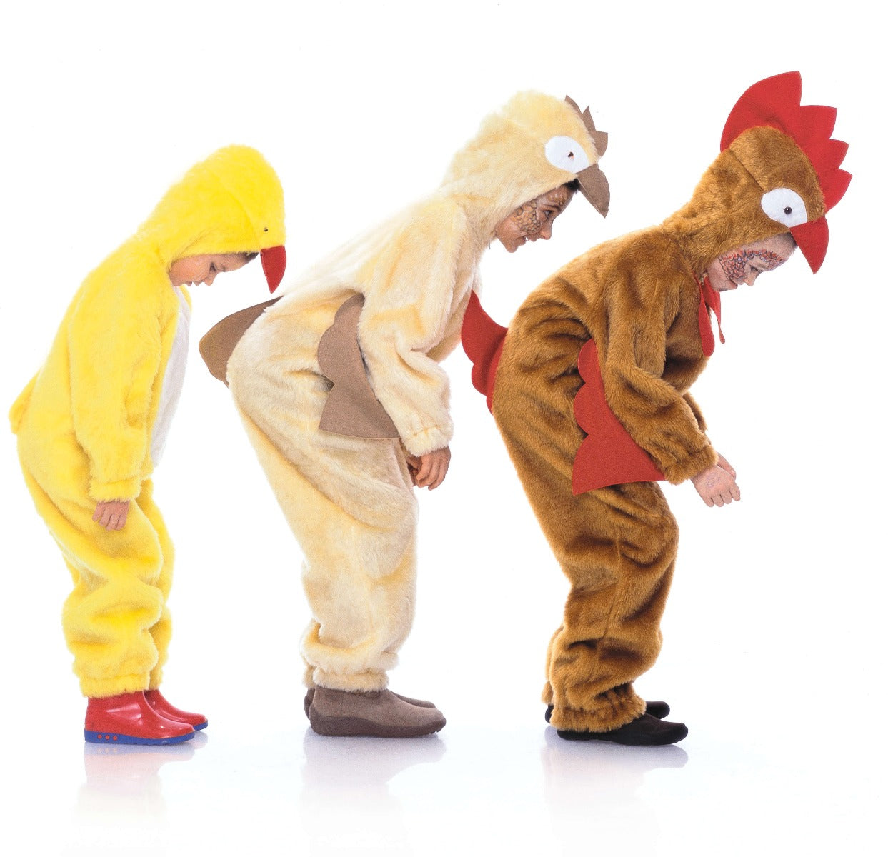 Patrones Burda para disfraz infantil de pollitos en 3 estilos distintos.