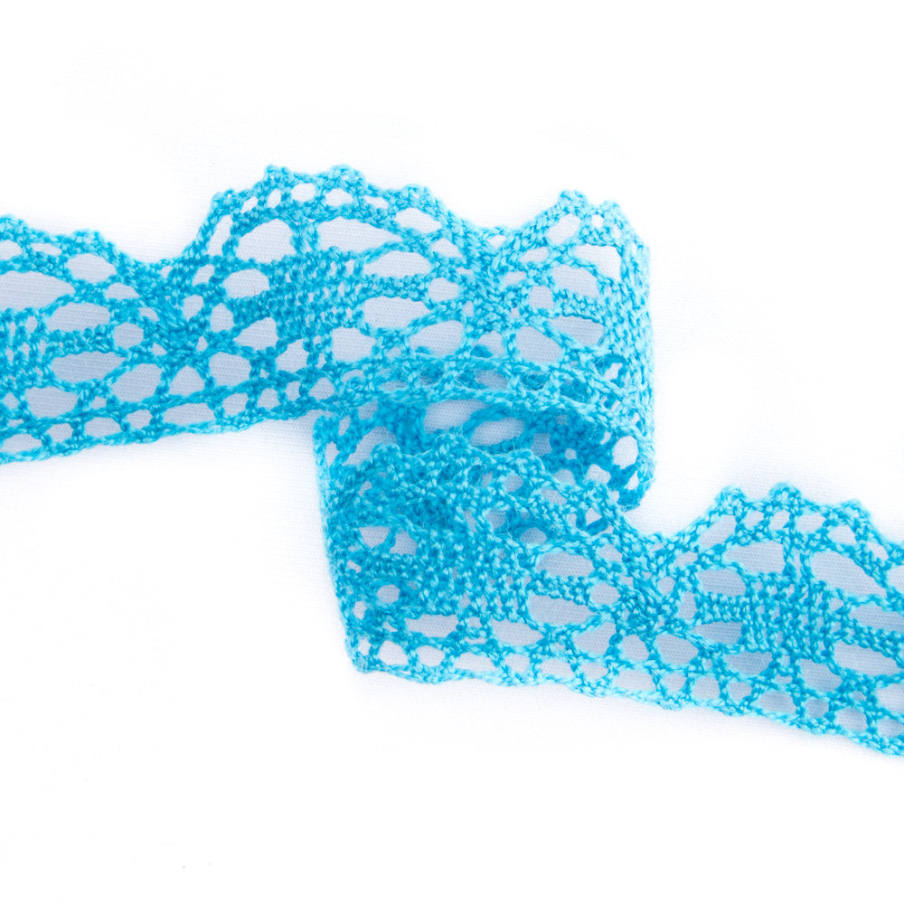 Tira de puntilla de poliéster en color azul. Tira de puntilla calada en forma de ondas de 2 cm de ancho toda del mismo color. Compra a partir de 1 metro, compra los metros de puntilla que necesites. Precio en oferta hasta agotar existencias.