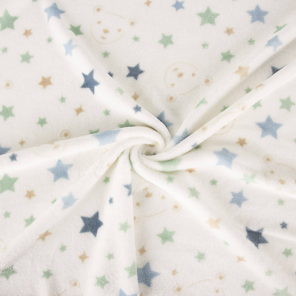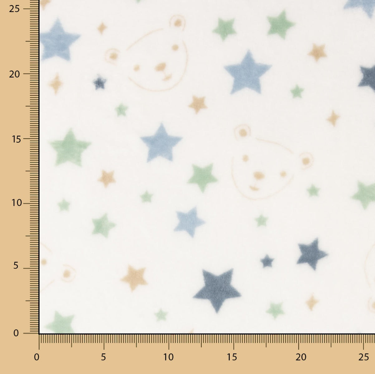Su adorable diseño con caritas de ositos y estrellas en tonos pastel sobre fondo blanco la convierte en una opción irresistible para confeccionar mantitas de bebé, pijamas, batas, sacos de dormir o ropa infantil.