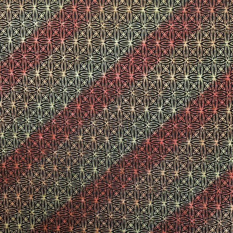 Lycra brillant de couleur blanche à paillettes rouges, dorées et cuivre en forme de fleurs à 4 feuilles. Les paillettes font un dégradé diagonal de couleur.  Tissu en lycra fin, avec corps et un très joli tombé. Doux ert agréable au toucher. Idéal pour la confection de maillots, body et costumes de danse, patinage artistique, bikinis, costumes de sène, déguisements et tous type de vêtement près du corps.* S'étire dans sa largeur.