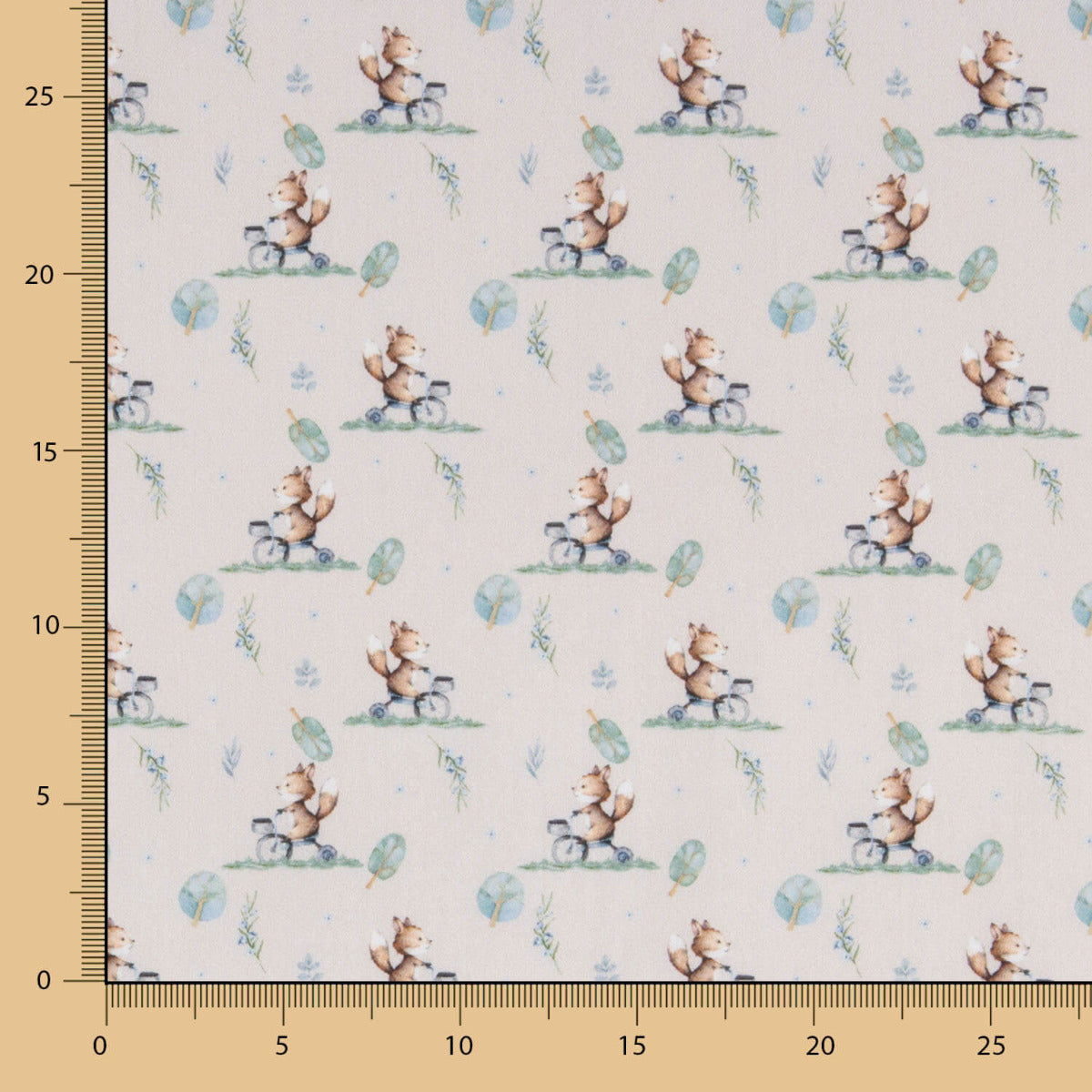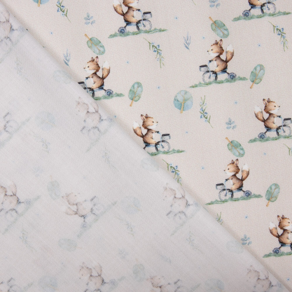Viyela de tissu en coton pour enfants avec dessin de vélo écureuil. Tissu très doux et agréable au toucher avec une texture pelucheuse parfaite pour les vêtements de mi-saison, les accessoires et les tissus pour enfants.