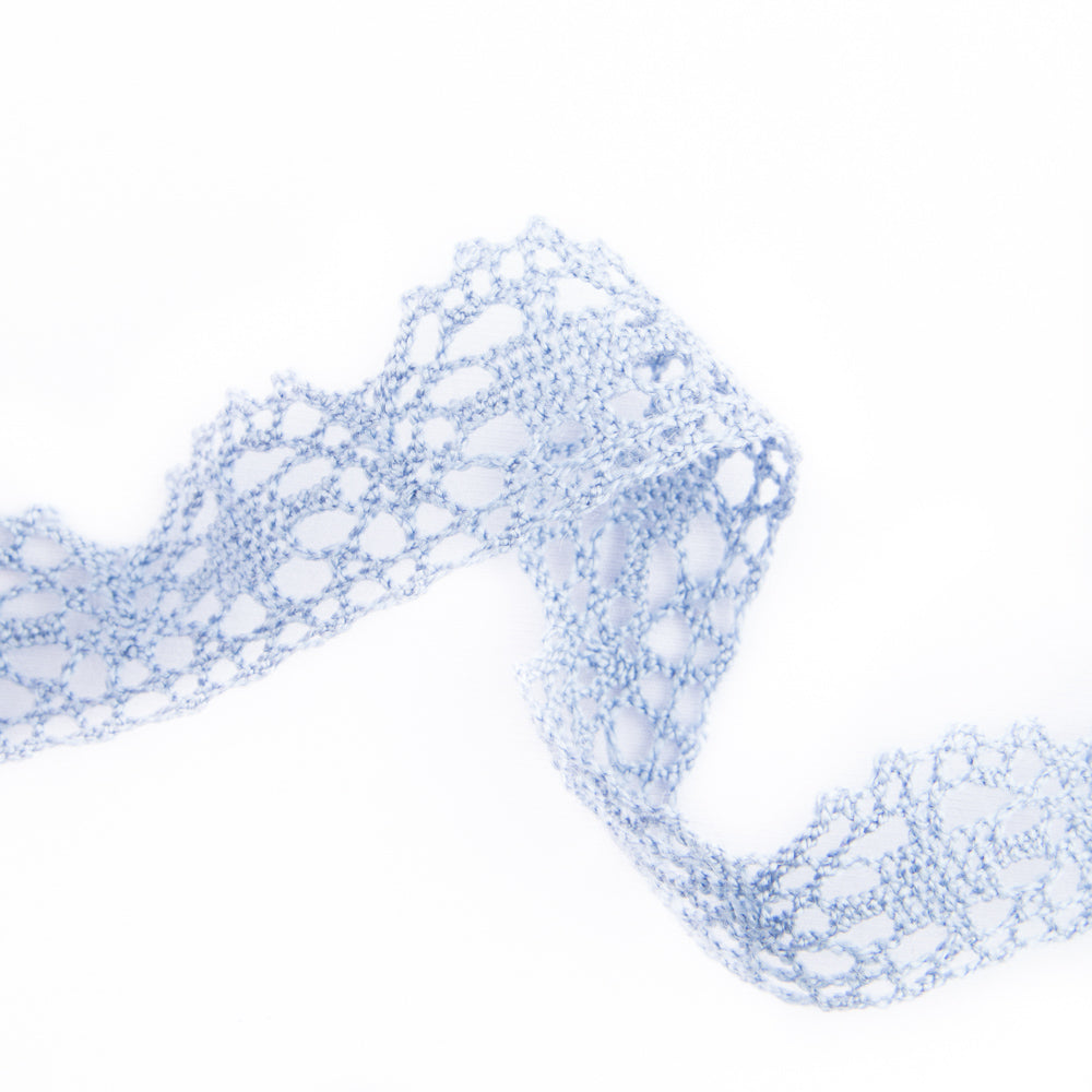 Tira de puntilla de poliéster en color azul porcelana. Tira de puntilla calada en forma de ondas de 2 cm de ancho toda del mismo color. Compra a partir de 1 metro, compra los metros de puntilla que necesites. Precio en oferta hasta agotar existencias.
