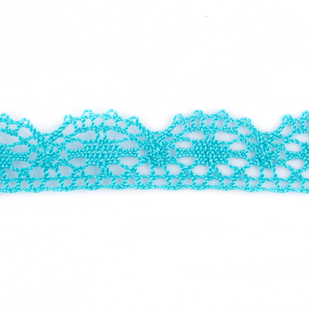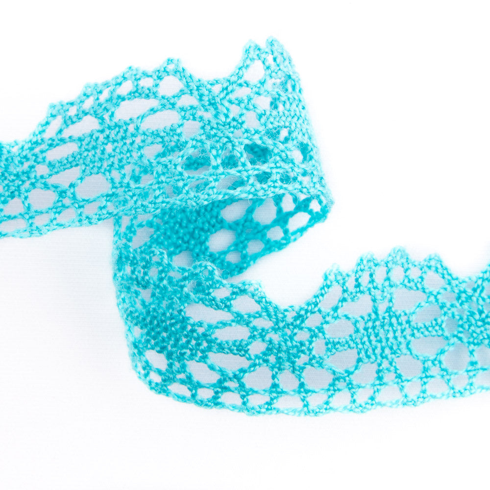 Tira de puntilla de poliéster en color Turquesa. Tira de puntilla calada en forma de ondas de 2 cm de ancho toda del mismo color. Compra a partir de 1 metro, compra los metros de puntilla que necesites. Precio en oferta hasta agotar existencias.