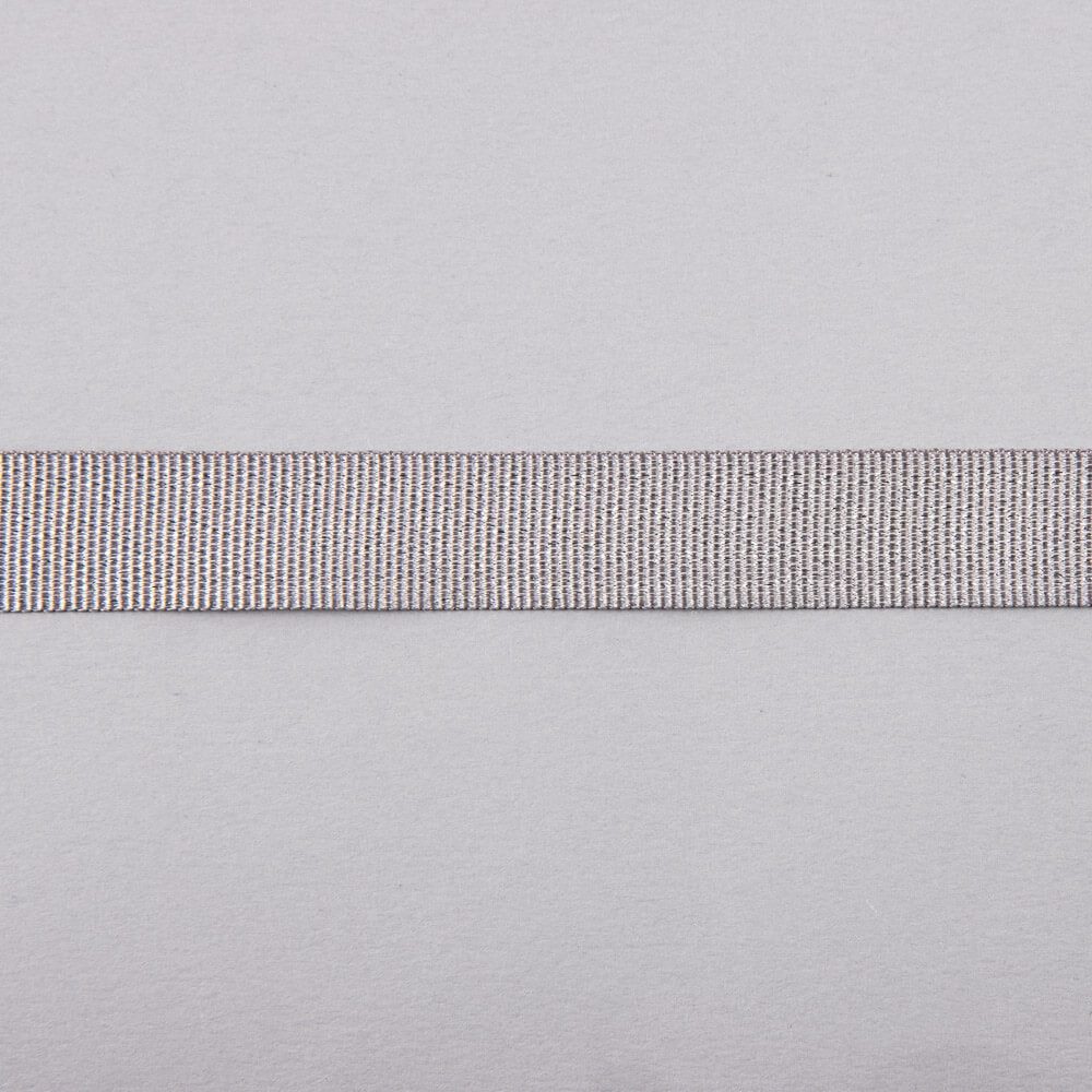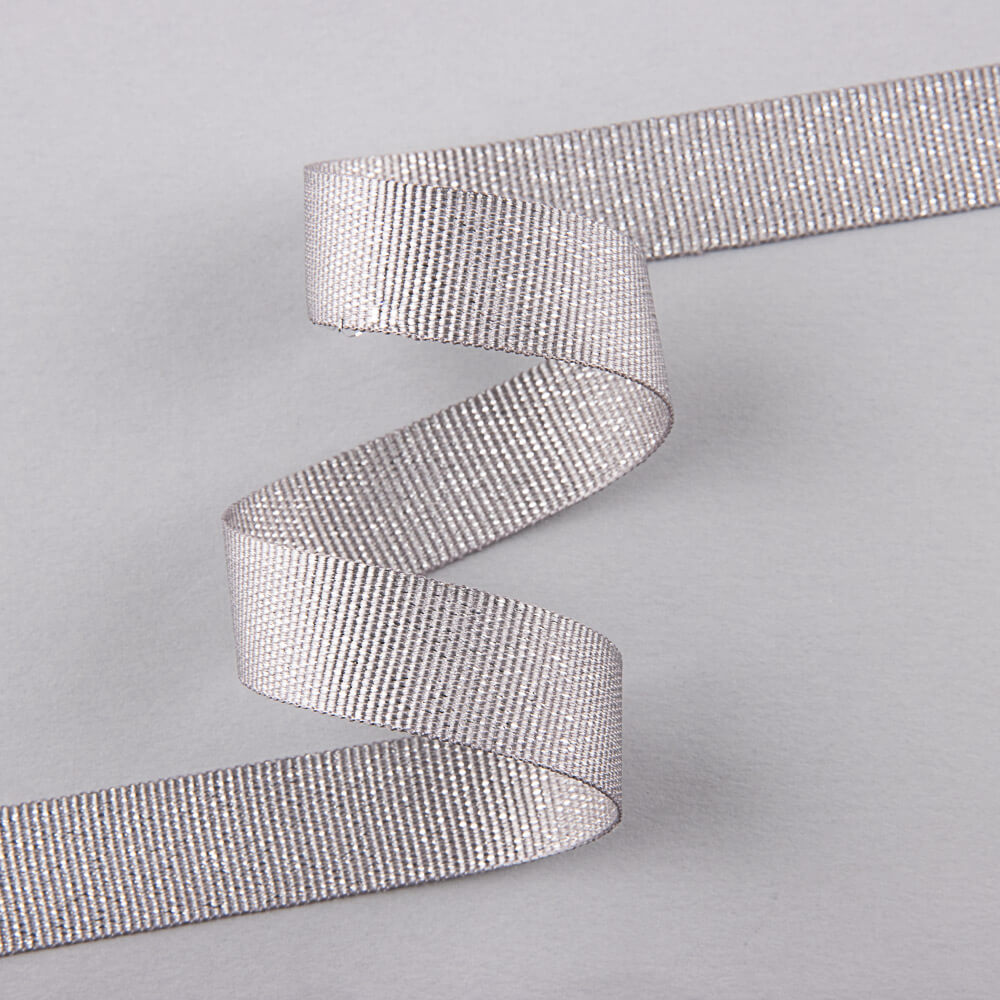 Ruban ottoman, de 15 mm de largeur, à lurex fantaisie pailleté argenté sur fond gris. Appelé aussi gros-grain, ce ruban est résistant et un peu rigide mais très malléable, avec un motif à rayures brillant. Vous pouvez le coudre comme un élément décoratif, personnaliser ou renforcer vos coutures. Vous pouvez acheter autant de mètres que vous le souhaitez, prix au mètre.