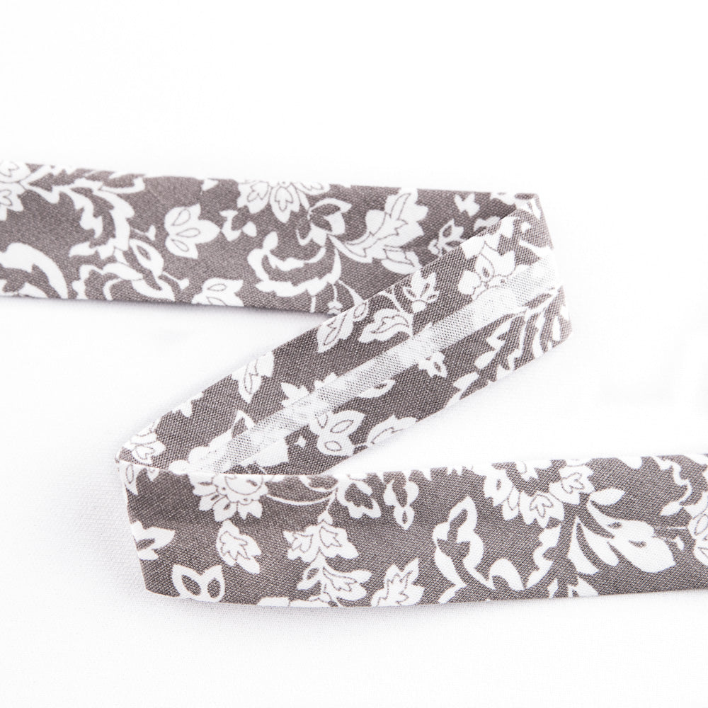 Ruban de biais profilé avec imprimé jardin en gris. Prix par mètre, commande minimum de 1 mètre. Largeur du ruban 18 mm.
