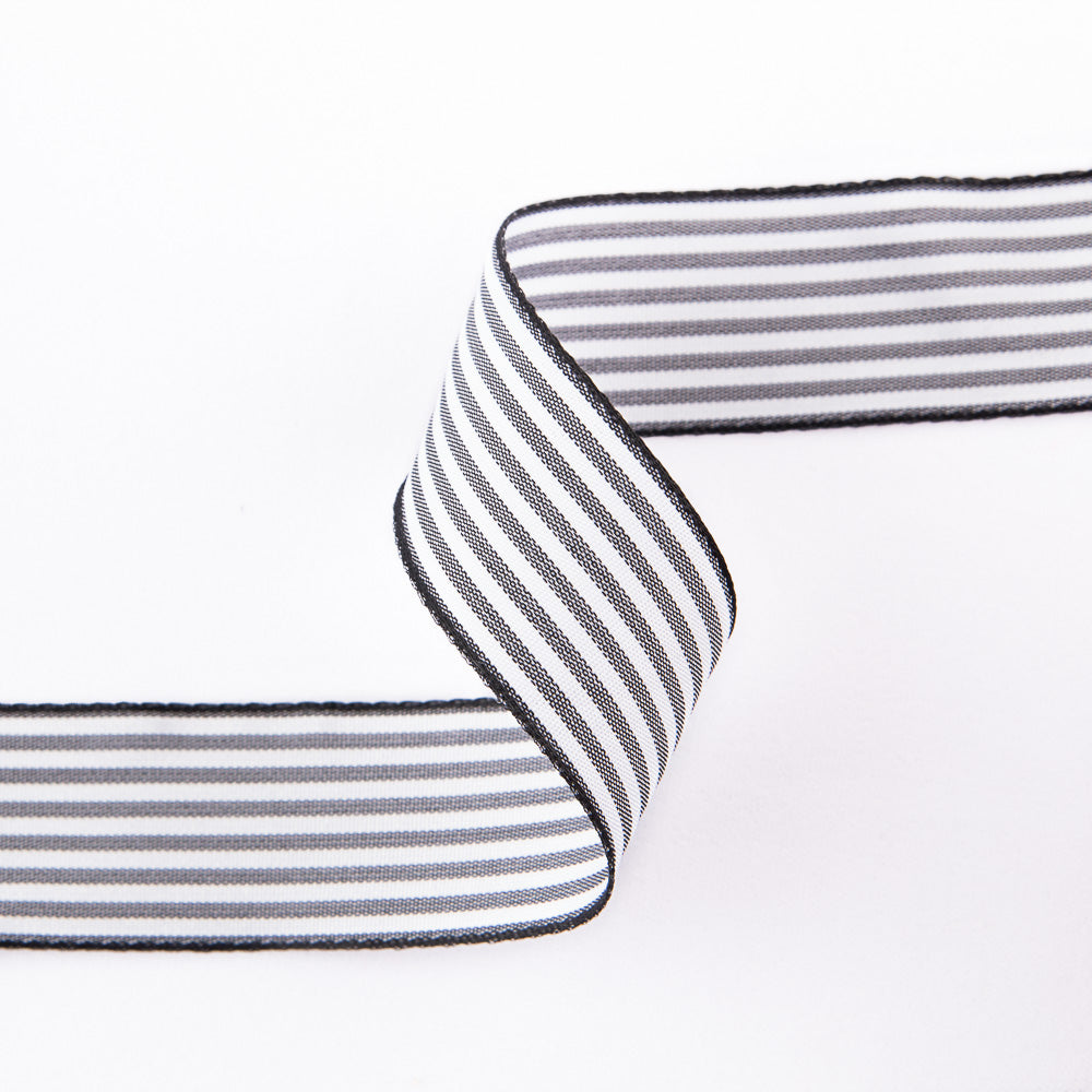 Ruban polyester listé en noir et blanc, disponible en 24 mm de largeur. Idéal pour les arcs, les décorations et en complément de vos créations, de l'artisanat... Prix au mètre à partir d'un achat minimum de 1 mètre.