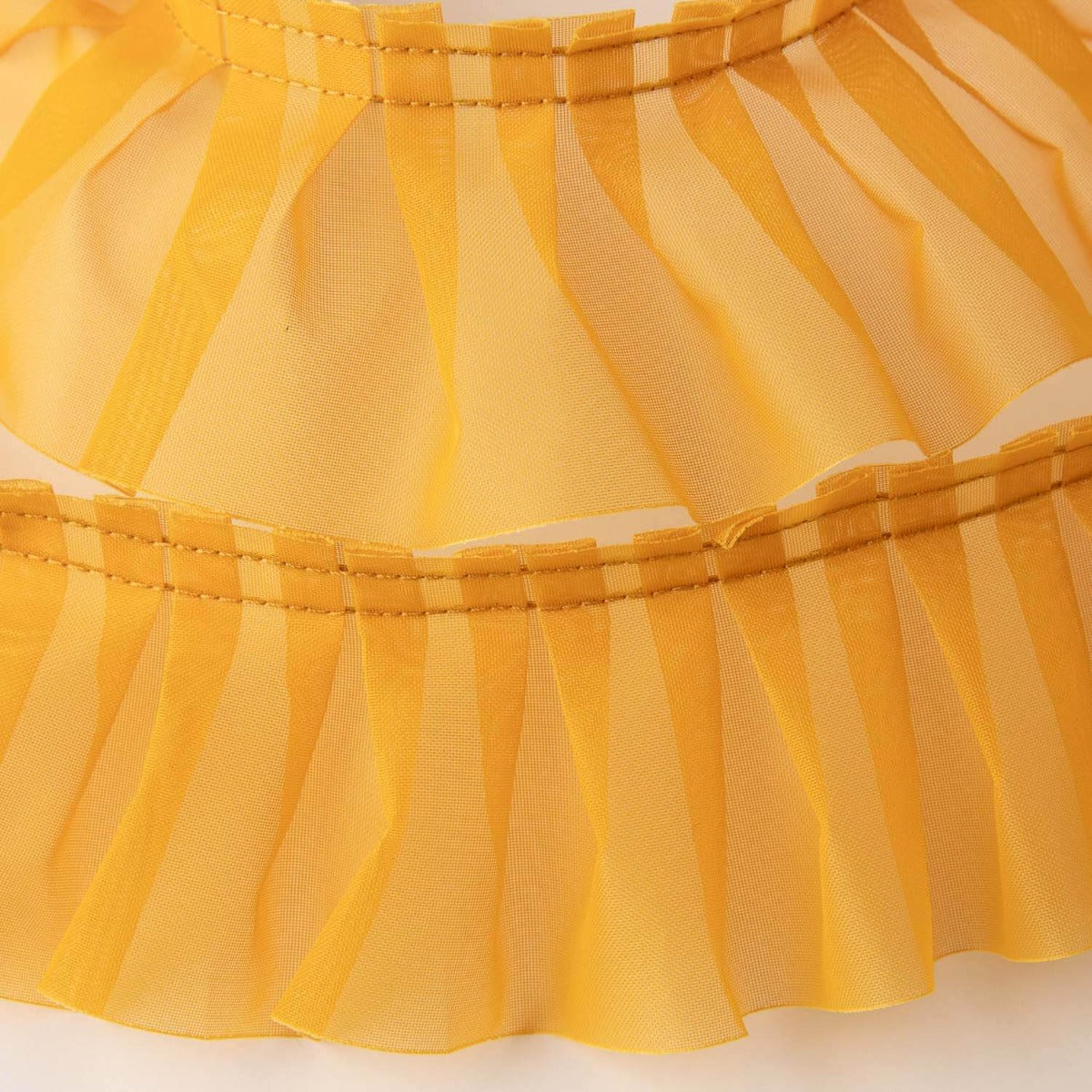 Con un ancho aproximado de 6 cm y fabricada en 100% poliéster, su fruncido en tablas en la parte superior añade volumen y estructura, ideal para realzar volantes, faldas y detalles decorativos.
