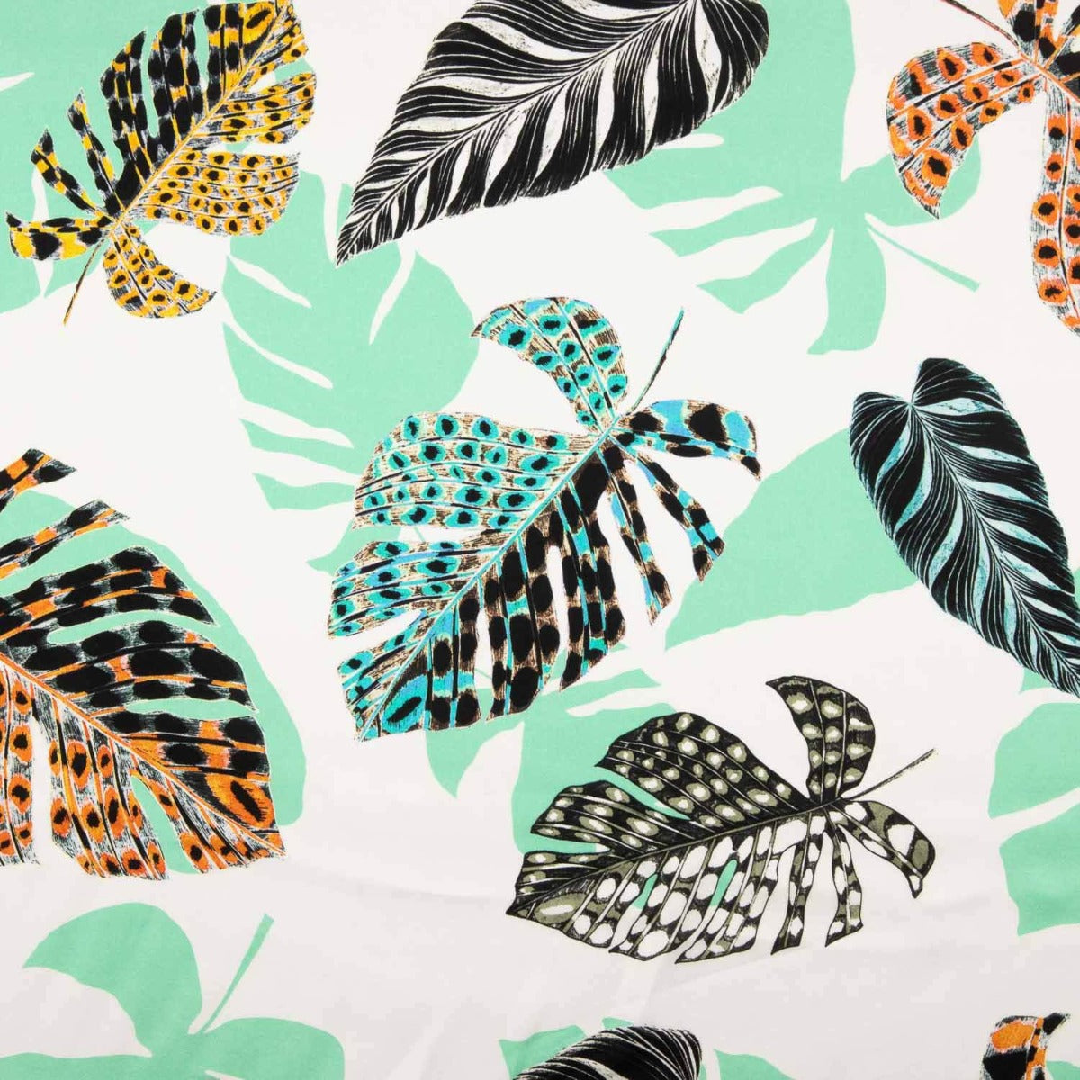 Explora la fusión entre lo salvaje y lo sofisticado con este exclusivo tejido de seda natural en satén con estampado de hojas tropicales estilizadas.