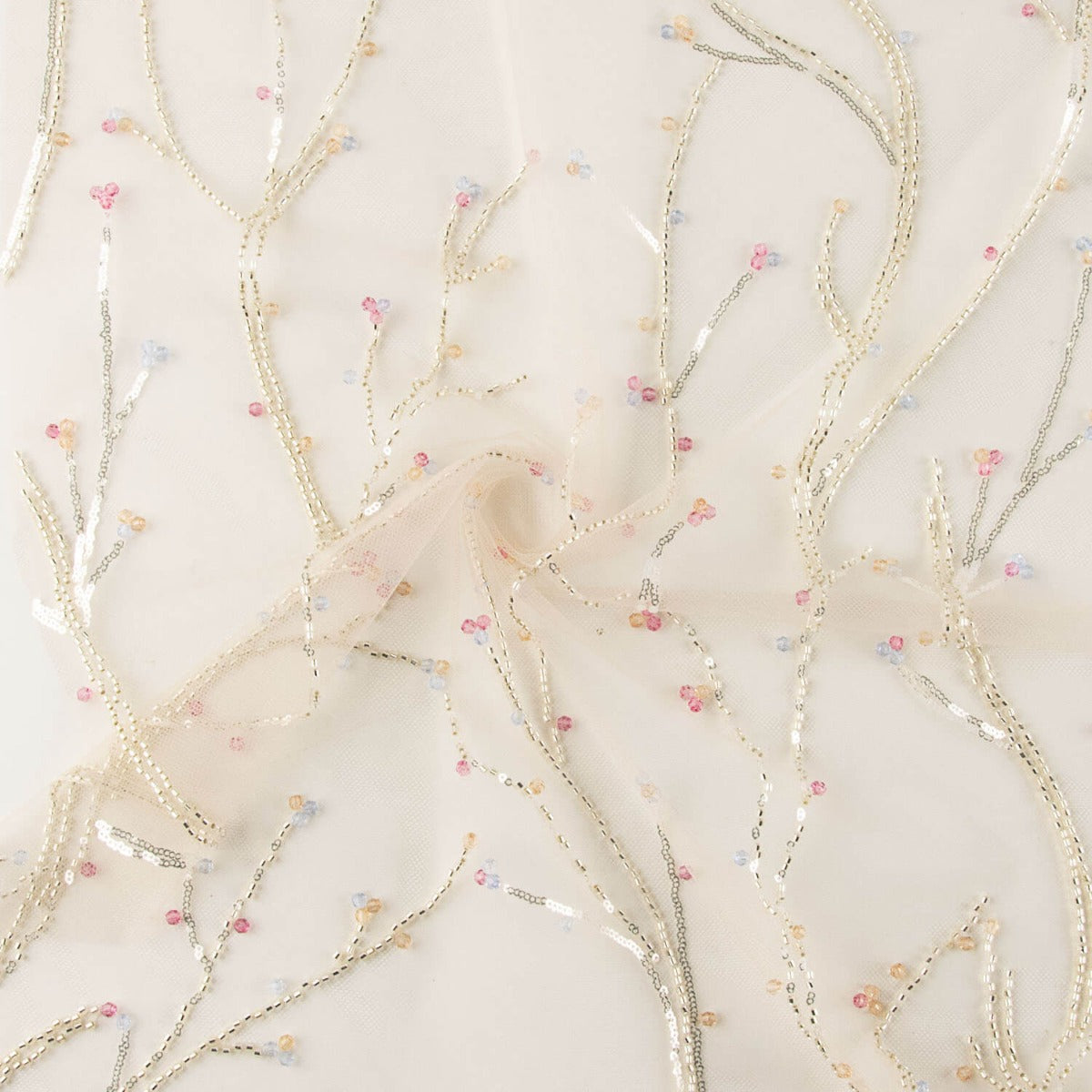 Base de tul transparente de color blanco bordado con cristales y lentejuelas en tonos a juego que aportan destellos y brillos en tus creaciones.