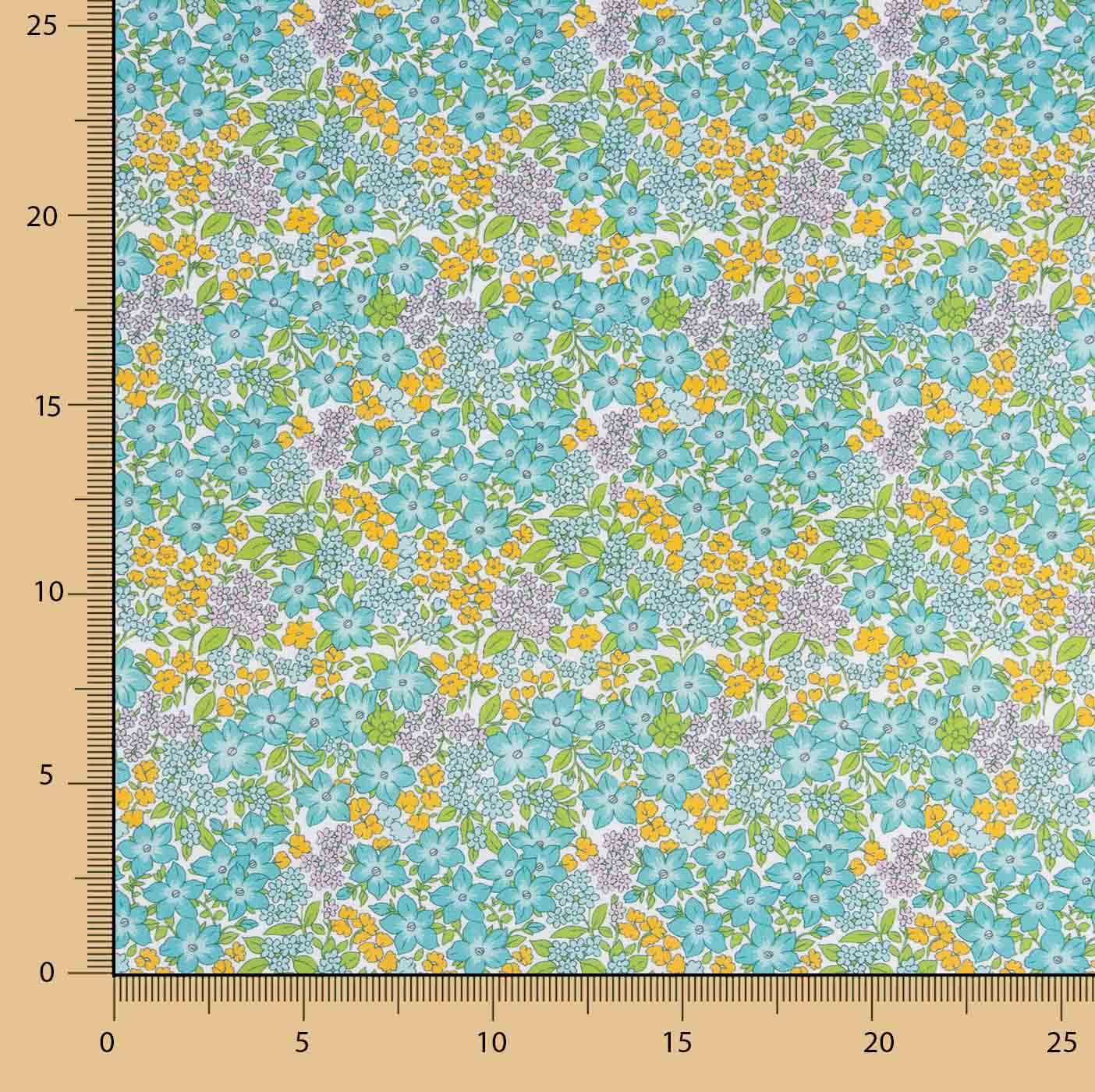 Percal imprimé floral vert d'eau et jaune confectionné en 100 % coton et tissé en percal 200 fils, qui offre douceur, fraîcheur et excellente résistance. Elle présente un délicat imprimé floral d'inspiration printanière dans des tons vert d'eau, jaune et petites nuances lilas sur fond clair, créant un motif frais, lumineux et plein de vie.