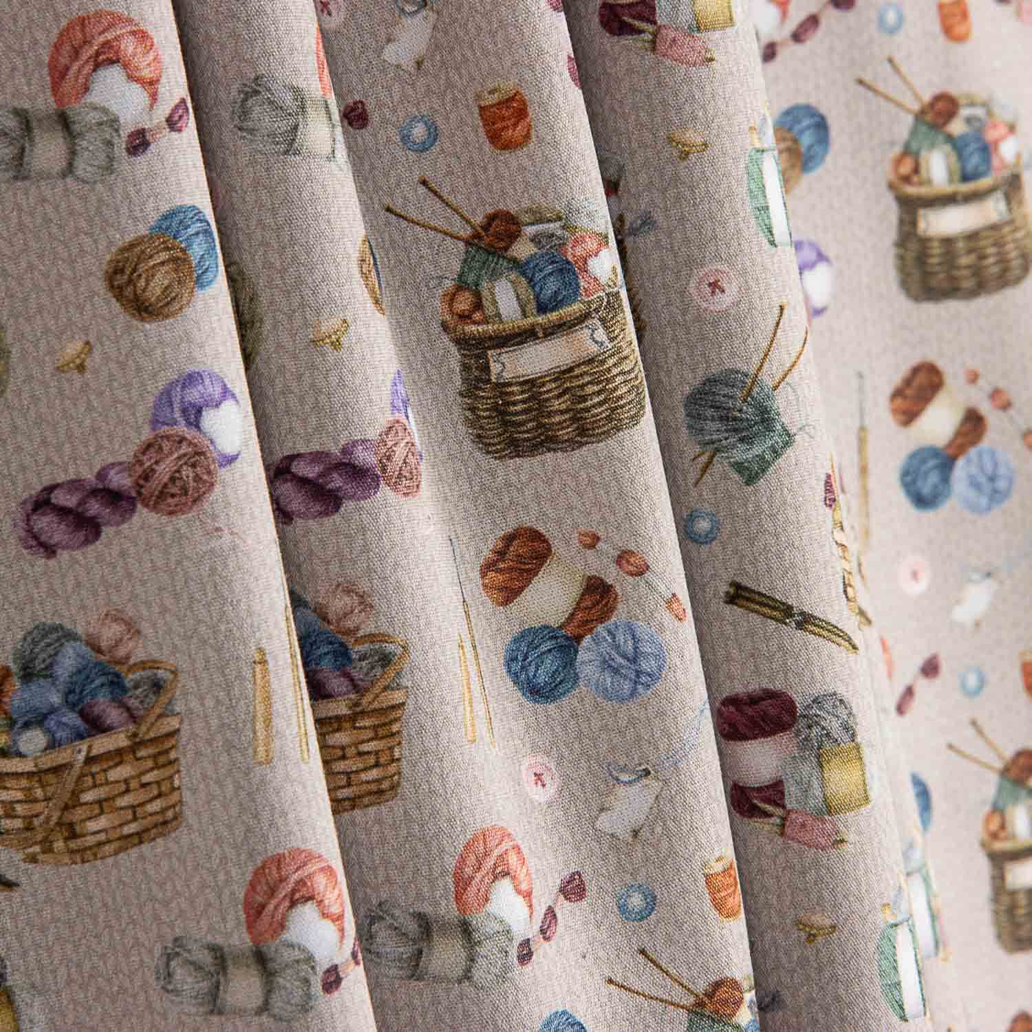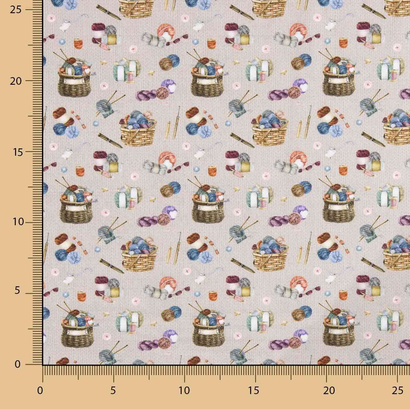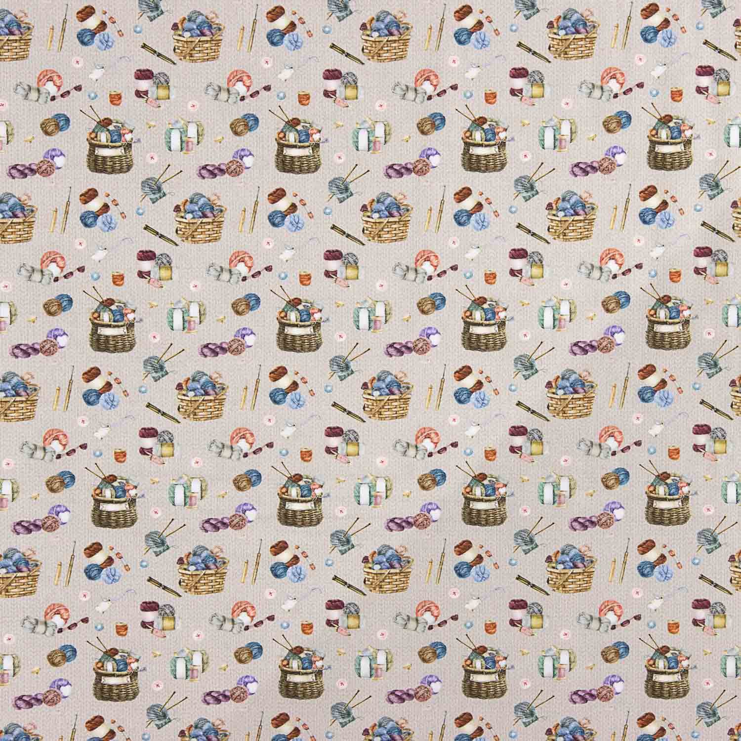 Tissu popeline 100 % coton de 150 cm de large avec imprimé de paniers contenant de la laine, des pelotes, des aiguilles à tricoter et de petits accessoires de couture dans des tons doux sur fond clair, créant un motif chaleureux, créatif et parfait pour les amateurs de tricot et de couture.