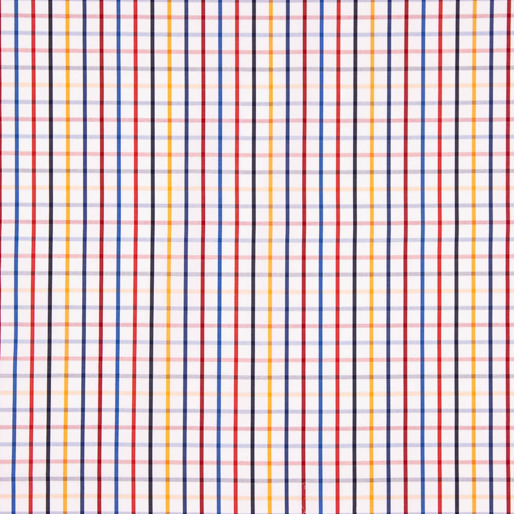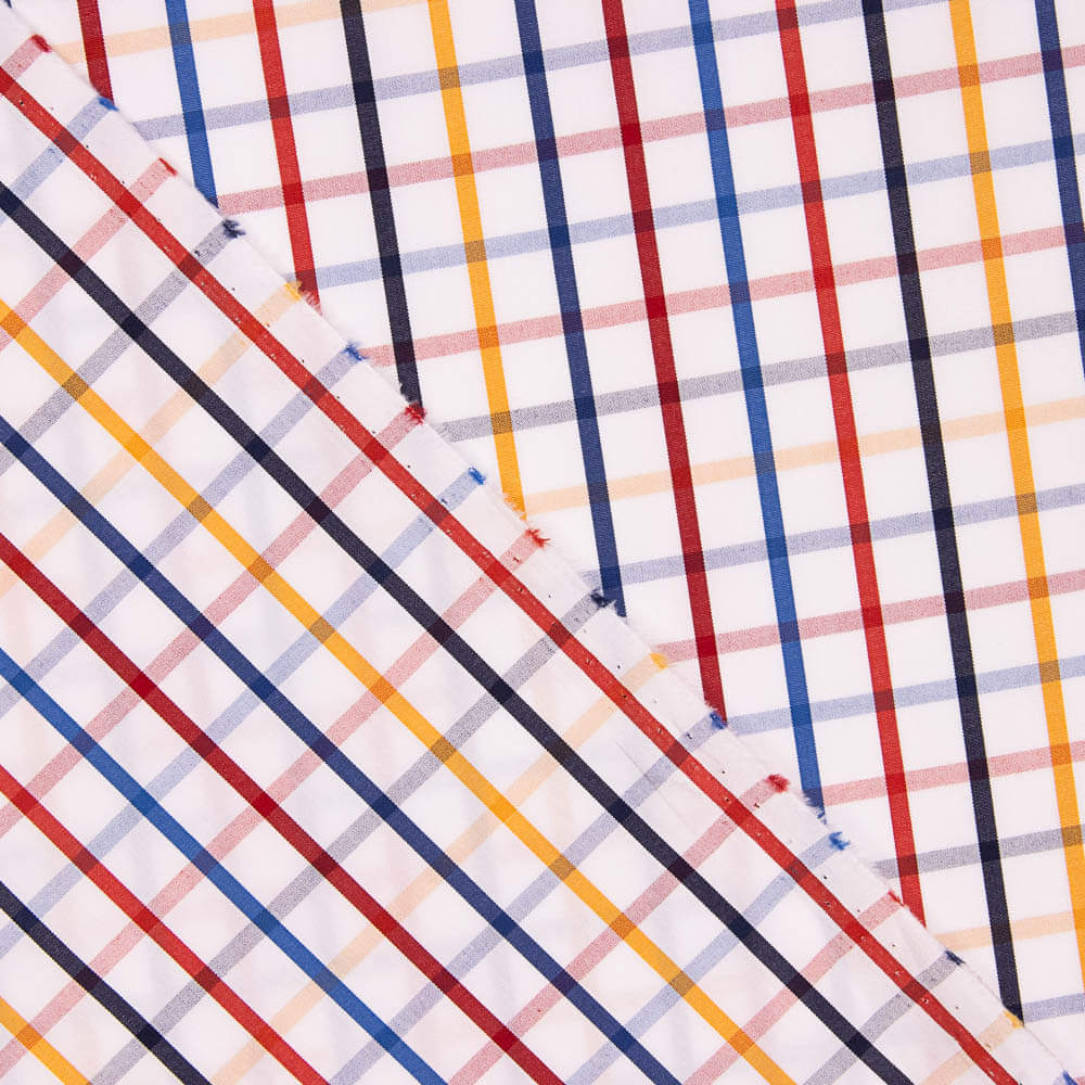 Tissu imprimé en popeline de coton à carreaux rayés multicolores sur fond blanc. La popeline est un tissu de coton à armure taffetas caractérisé par sa finesse et sa résistance, parfait pour les chemises à imprimé à carreaux. Sa structure ferme et son toucher doux constituent une toile parfaite pour l'application de motifs complexes. En outre, sa capacité à retenir les couleurs de manière vibrante permet aux imprimés à carreaux de conserver leur netteté et leur éclat au fil du temps.