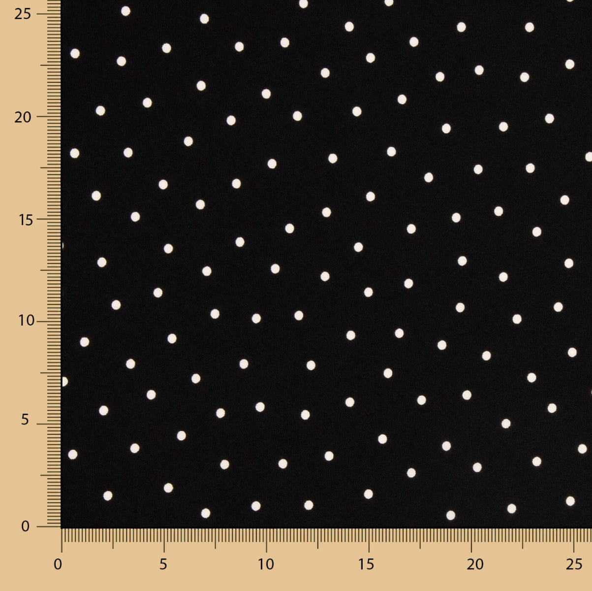 Tissu plat en polyester extensible avec impression à pois 0,5cm noir. Tissu plat avec 3% de stretch fin avec une texture légèrement rugueuse, parfait pour la couture de jupes, pantalons, robes flamenco.