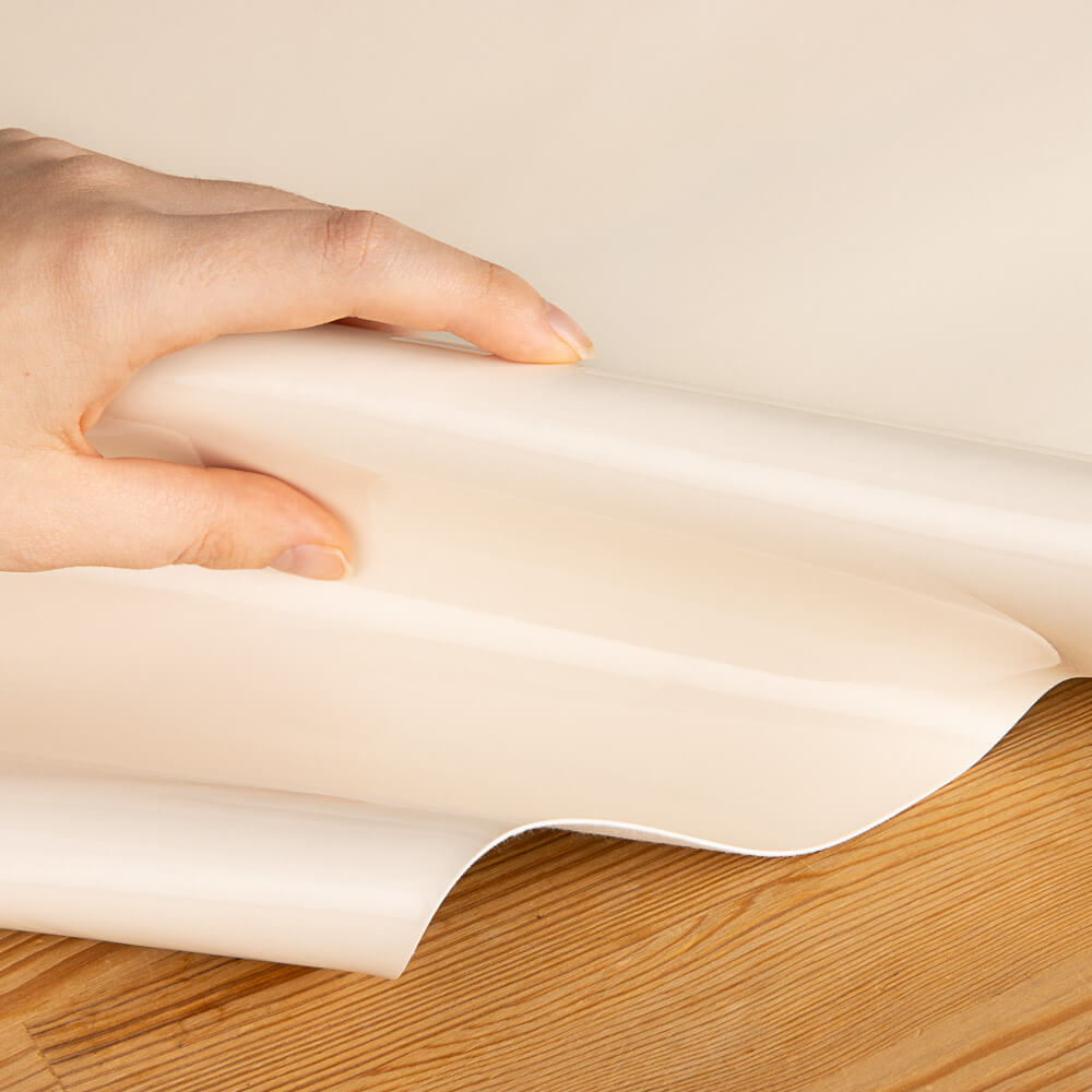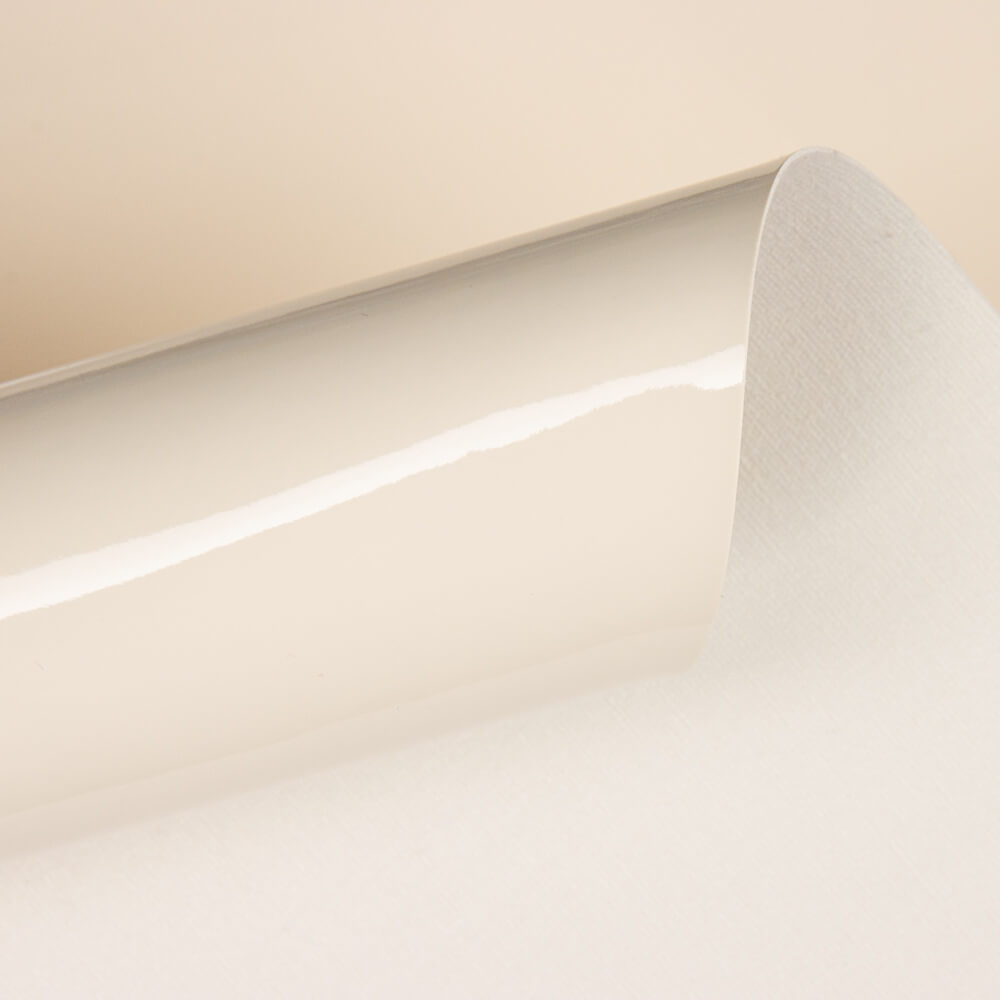 Cuir verni rigide écru. Tissu en cuir verni avec un effet plastique brillant. Tissu rigide, doux au toucher, semblable à du plastique. Parfait pour coudre des tissus pour enfants tels que des porte-biberons, des sacs de voyage, des trousses de toilette.