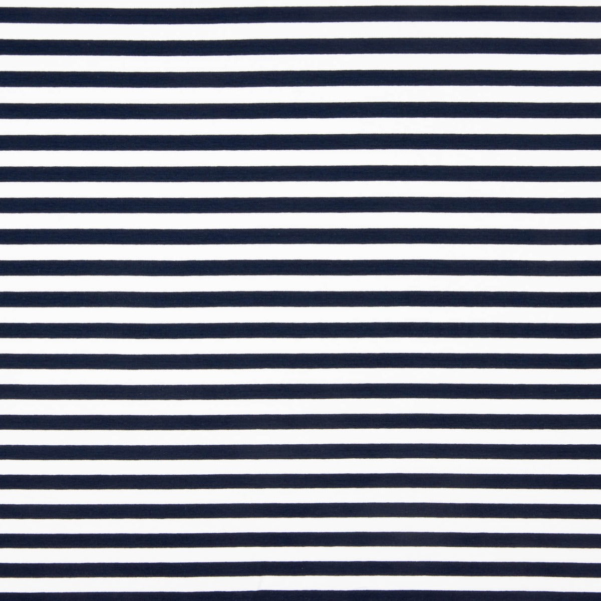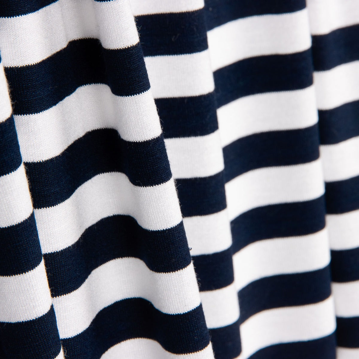 Ce jersey de viscose à larges rayures bleu marine et blanches (10 mm) est un essentiel moderne avec une touche nautique, parfait pour des tenues fraîches et élégantes. Composé à 96 % de viscose et à 4 % d'élasthanne, il offre une douceur et un tombé exceptionnels, ainsi qu'une élasticité bidirectionnelle, ce qui le rend idéal pour des vêtements confortables et flatteurs. Avec sa largeur de 150 cm, il est parfait pour les t-shirts, les robes, les jupes, les combinaisons courtes, les pyjamas ou les vêtements d'intérieur pour la mi-saison. Les rayures audacieuses lui confèrent un look marine plus saisissant et contemporain, idéal pour celles qui recherchent un style maritime plus affirmé.