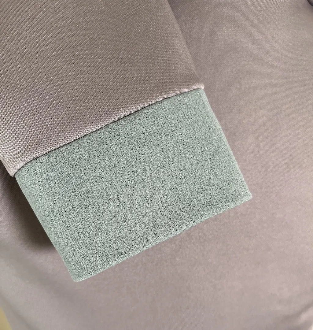 Tissu en maille crêpe gris verdâtre avec du corps et du drapé, connu sous le nom de Néoprène ou Scuba. Le néoprène est un tissu tricoté à petit grain très similaire au crêpe. Il se caractérise par un drapé important et donne un certain volume aux vêtements cousus. Il est parfait pour coudre des robes moulantes, des jupes, des vestes et d'autres vêtements à la mode.