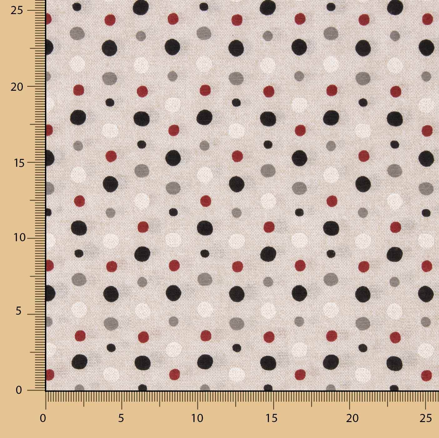 La Loneta de Lunares Negro, Gris y Rojo est un tissu décoratif moderne et polyvalent, avec un imprimé à petits pois multicolores sur un fond de type lin clair qui apporte du dynamisme et une touche contemporaine à n'importe quel espace.