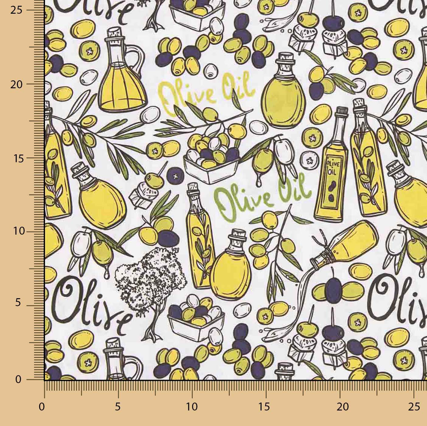 Cette popeline 100 % coton, d'une largeur de 150 cm, présente un imprimé gastronomique représentant des bouteilles d'huile, des olives et des branches d'olivier sur fond blanc. Idéal pour les projets de cuisine, tabliers, nappes, sacs ou décorations sur le thème méditerranéen. C'est un tissu doux, facile à coudre et au charme rustique.