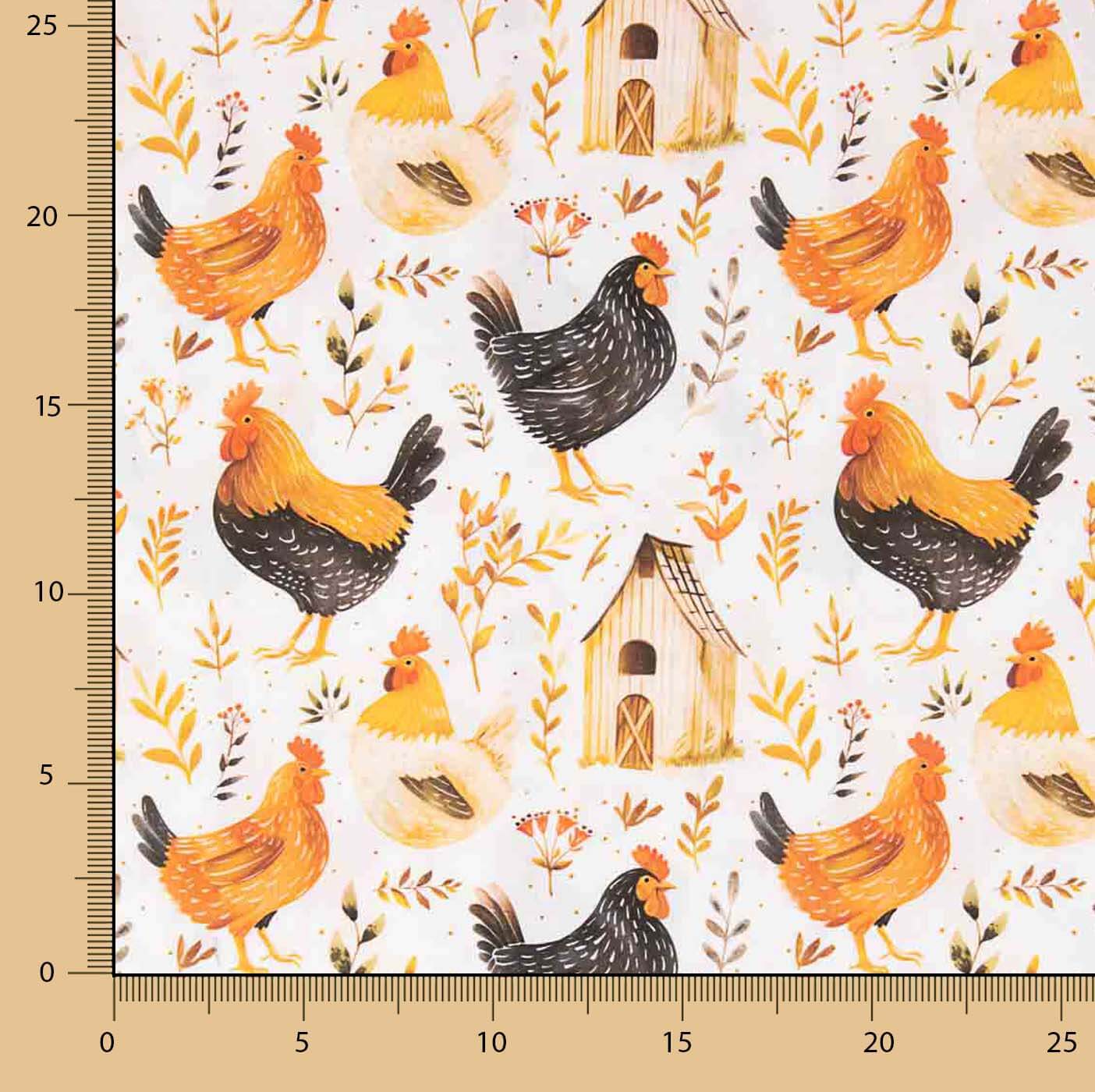 Cette popeline 100 % coton, d'une largeur de 150 cm, présente un charmant imprimé de poules, poussins et cabanes en bois dans des tons chauds sur fond blanc. C'est un tissu doux, résistant et facile à coudre, idéal pour des tabliers, des nappes, des coussins, des sacs ou des vêtements pour enfants dans un style champêtre.