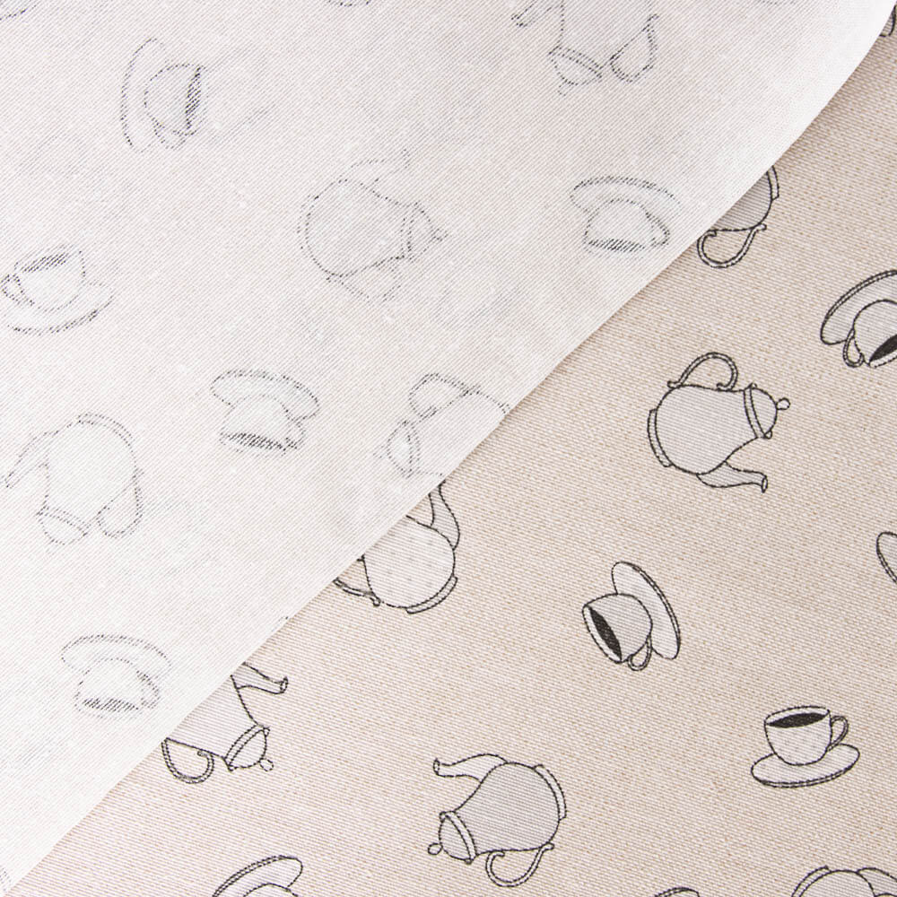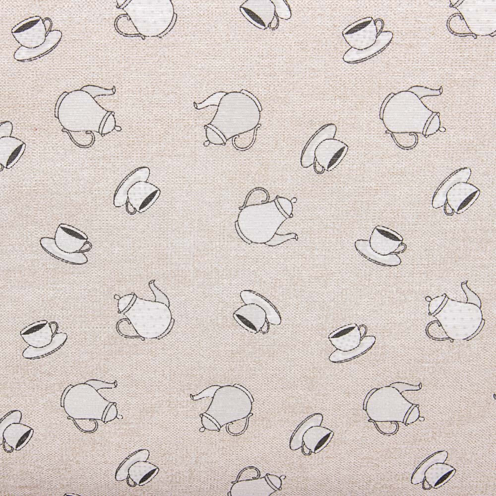 Tissu en coton fin de style lin avec un motif de tasses et de théières sur un fond beige. La nappe antitache est un tissu de qualité similaire à la toile cirée, mais qui peut être nettoyé en machine à laver.L'avantage de ce type de nappe est qu'elle ne s'effiloche pas, ce qui permet de réaliser une nappe sur mesure sans couture.Elle protégera également votre table de tout liquide renversé sur la nappe, car le tissu l'empêche de se répandre immédiatement.