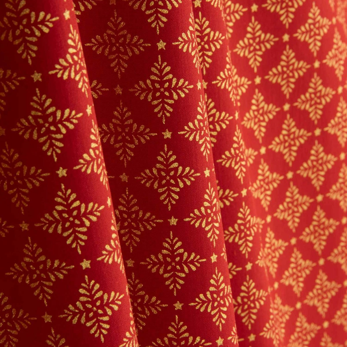 Cet élégant tissu 100 % coton popeline, d'une largeur de 145 cm, allie la douceur et la résistance du coton à un imprimé lamé doré scintillant pour une finition sophistiquée. Sa couleur rouge cramoisi vif et son motif géométrique doré en font un choix idéal pour les vêtements de fête, les costumes traditionnels, les chemisiers originaux, les chemises tendance ou les décorations avec une touche luxueuse. Léger mais structuré, ce tissu est parfait pour les projets créatifs qui visent à se démarquer avec style.