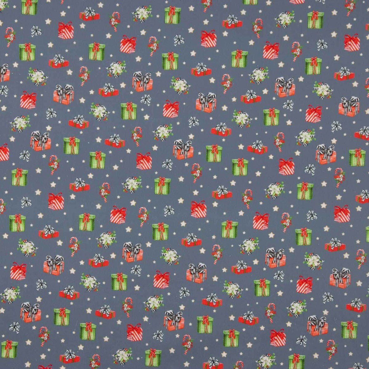 Tissu 100 % popeline de coton avec un imprimé festif représentant des boîtes-cadeaux, des rubans, des cannes en sucre et des petites étoiles sur un élégant fond bleu grisâtre. Cette combinaison de couleurs donne au tissu une touche contemporaine sans perdre l'essence joyeuse de Noël. La popeline est un tissu en coton doux, léger et structuré, idéal pour la confection de vêtements et la décoration. Sa surface lisse met en valeur la clarté de l'imprimé, rendant les couleurs vives et bien définies. Parfait pour créer des nappes, des chemins de table, des coussins, des sacs cadeaux réutilisables, des objets artisanaux, des patchworks ou tout autre projet textile dans un style moderne et festif.