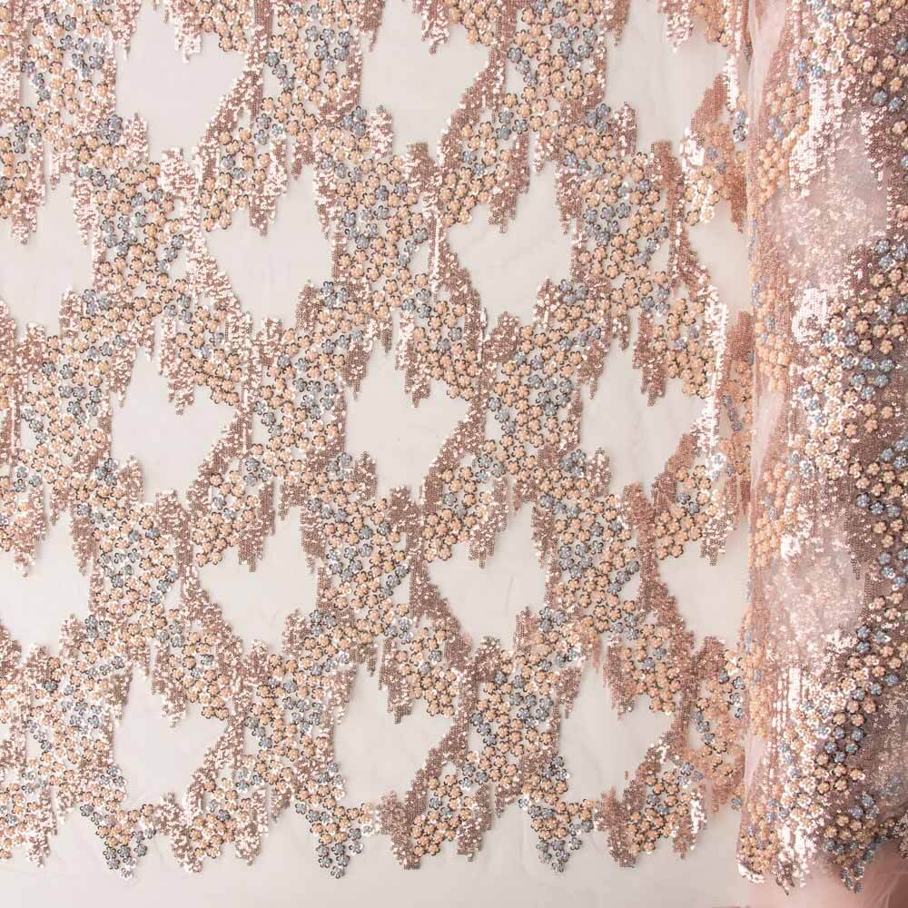 Tissu de tulle rose pâle avec strass modèle Lina avec poids. Base de tulle transparent rose pâle brodée de cristaux et de paillettes dans des tons assortis pour ajouter de l'éclat et de la brillance à vos créations.  Finition sur les deux lisières avec un motif différent, que vous pouvez utiliser pour finir l'ourlet, l'encolure, la taille ou les manches. Tissu en tulle caractérisé par la brillance et le drapé apportés par le poids des strass, ainsi que par les transparences créées par le tulle. Apportez un soin particulier à la couture en retirant manuellement les pierres et les paillettes dans les zones de couture, puis en les replaçant, en recouvrant les espaces pour obtenir une finition professionnelle.