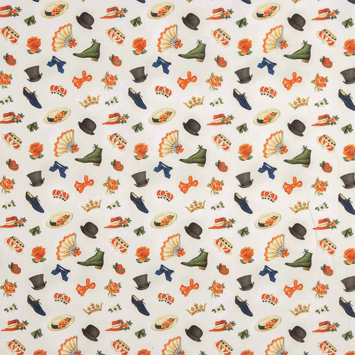 Cette popeline de coton de 150 cm de large, avec une composition 100 % coton, présente un charmant imprimé vintage de divers accessoires tels que des chapeaux, des nœuds, des fleurs et des couronnes. Avec son motif amusant et coloré sur fond clair, elle est idéale pour le patchwork, la décoration et la création de vêtements uniques. La douceur et la légèreté du tissu le rendent parfait pour créer des couvre-lits, des coussins ou même des accessoires de mode avec une touche nostalgique et unique.
