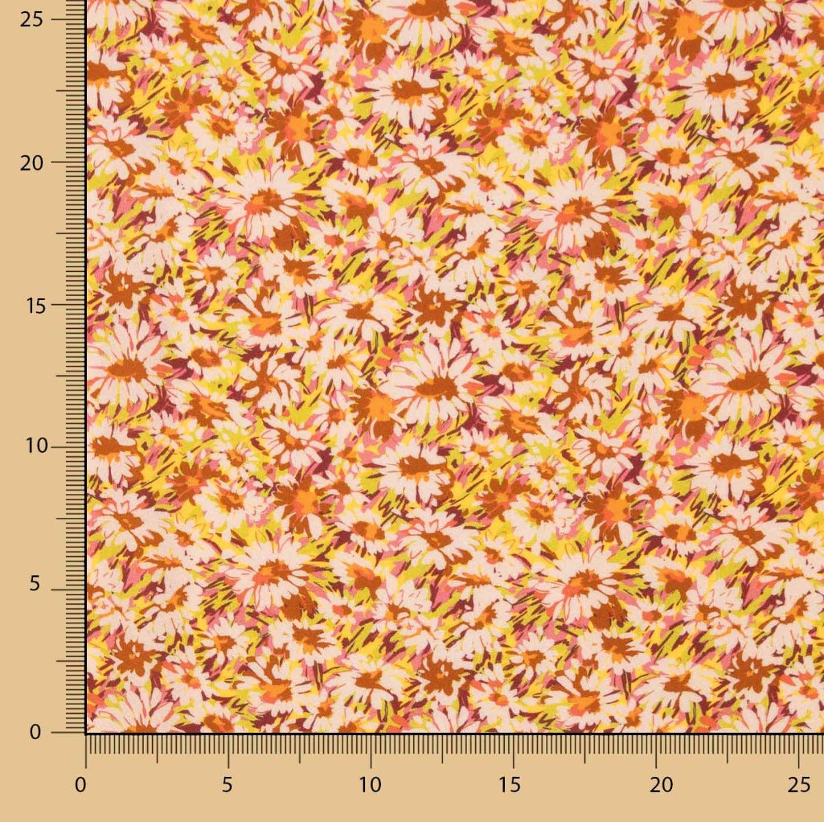 Tissu en crêpe de viscose à l'imprimé floral multicolore où le vert domine sur un fond saumon doux. Ce tissu combine la douceur et le drapé fluide de la viscose avec la texture rugueuse et mate du crêpe, créant ainsi un tissu sophistiqué et polyvalent. Parfait pour coudre des blouses, des robes et des jupes, son motif ajoute une touche distinctive et moderne à n'importe quel vêtement. Maintenant à un prix de vente en ligne irrésistible, derniers mètres.