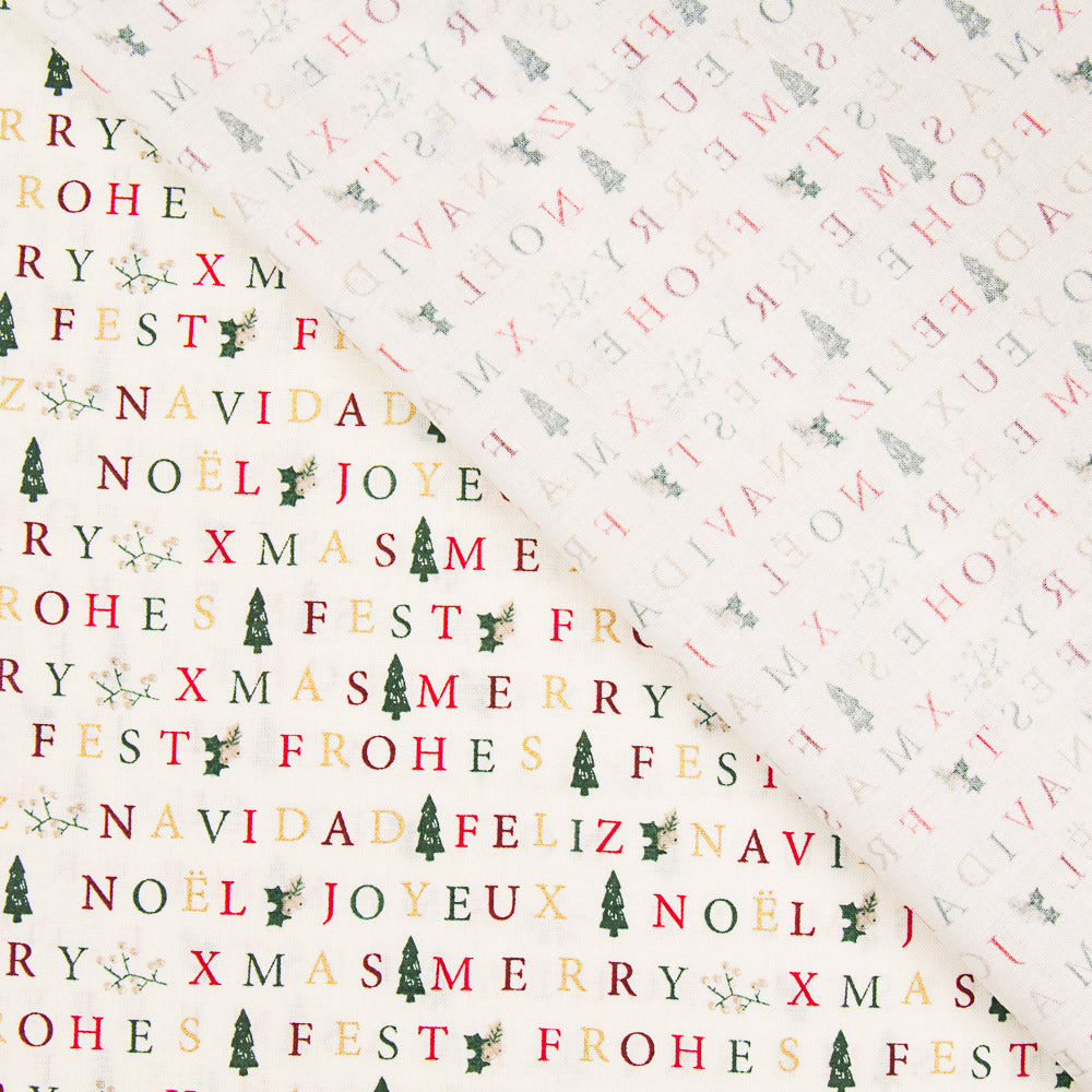 Tela de navidad estampada con letras deseando feliz navidad con fondo crudo. El popelín es una tela de algodón muy versátil, suave, fina y sostenida. Tela de algodón ideal para decoración de navidad, manteles y patchwork.