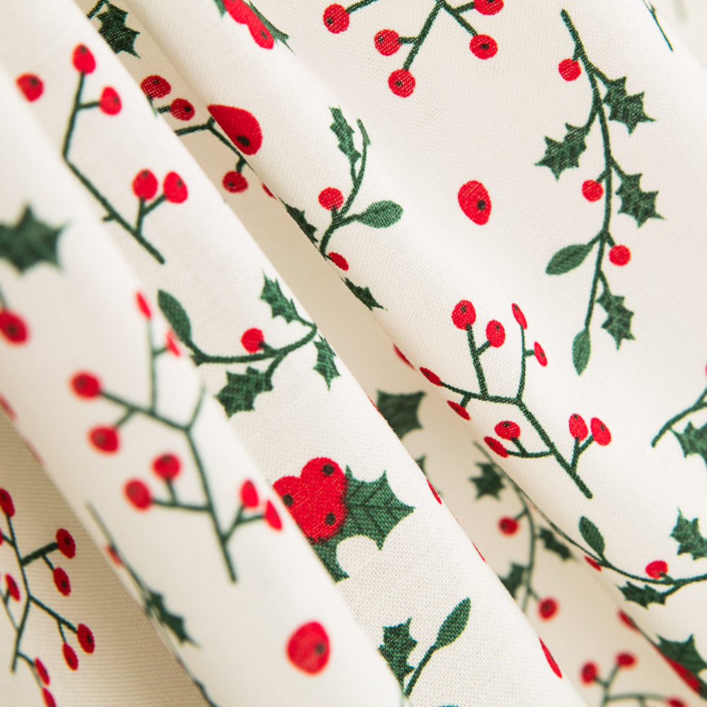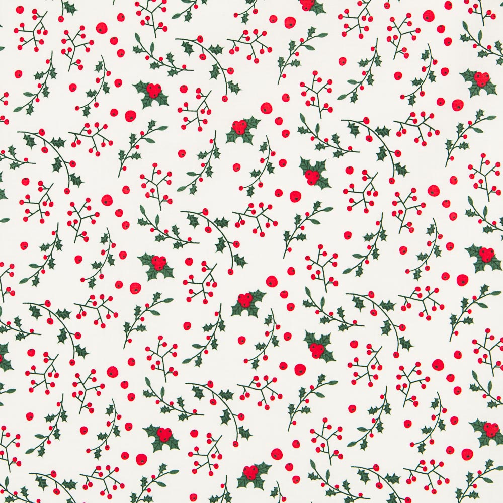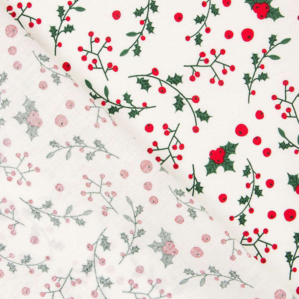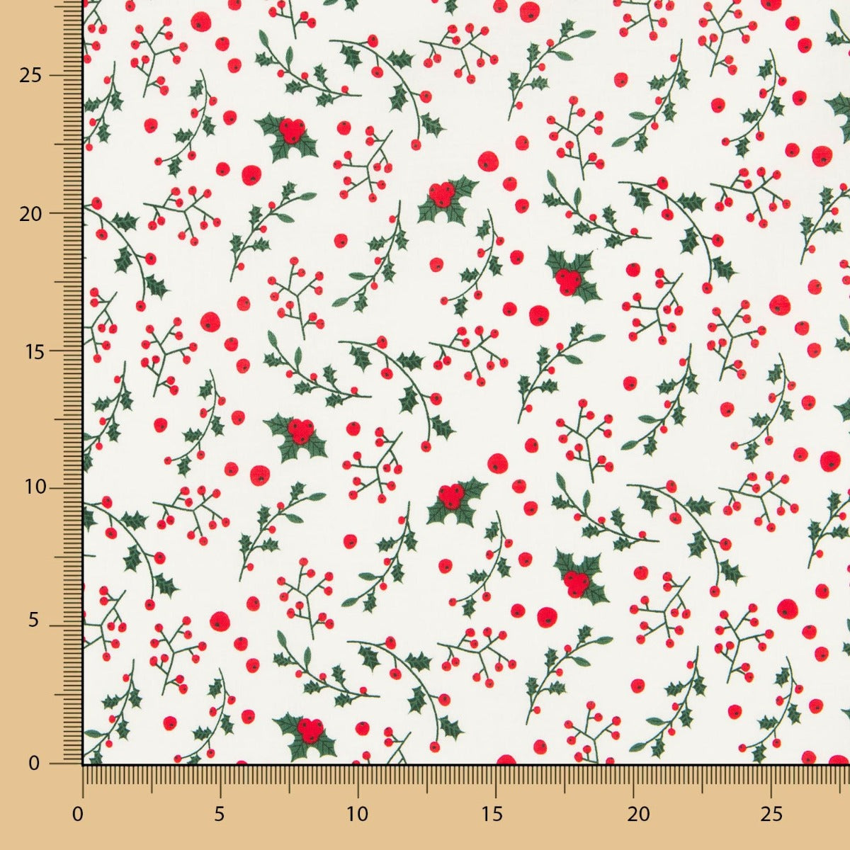 Tela de navidad estampada con muérdago sobre fondo crudo. El popelín es una tela de algodón muy versátil, suave, fina y sostenida. Tela de algodón ideal para decoración de navidad, manteles y patchwork.