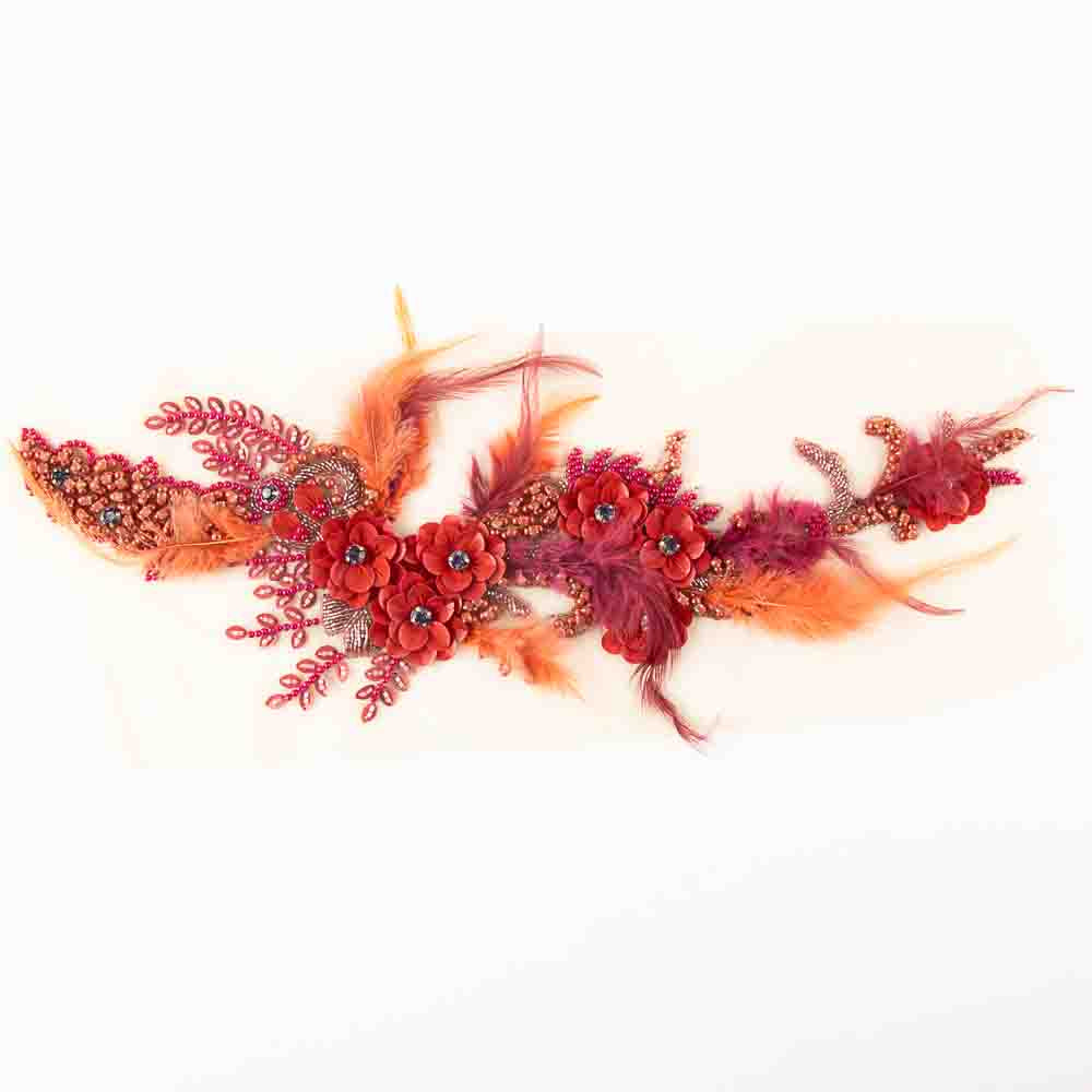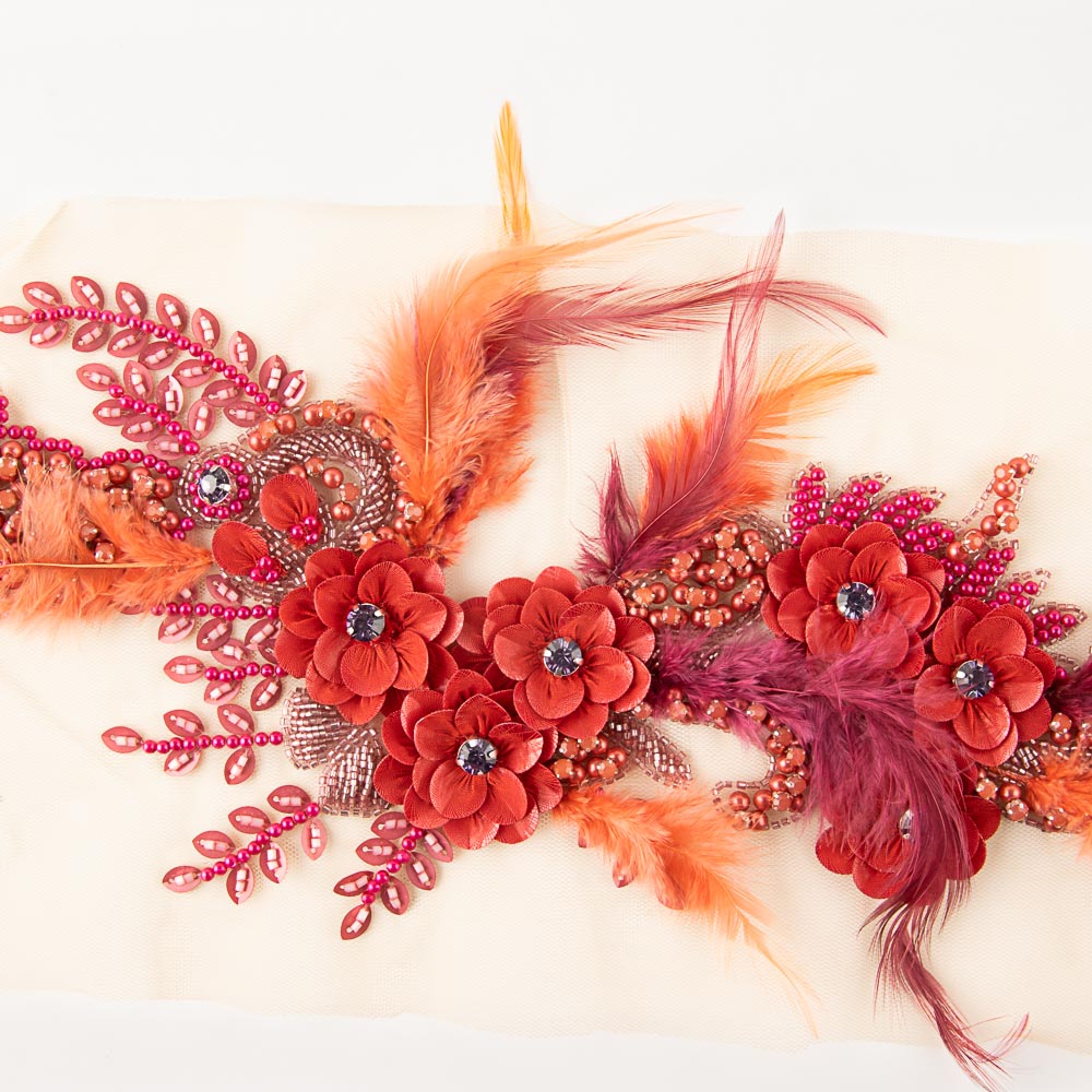 Aplique de piedras brillantes que combinan con figuras de flores y plumas en tonos rojos.