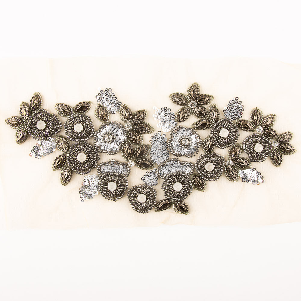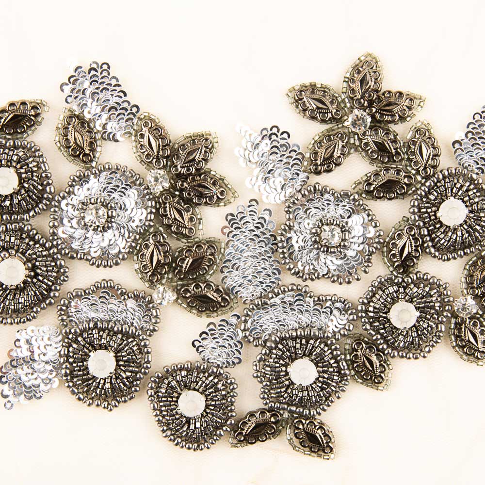 Aplique de piedras brillantes y formas de flores en tonos plateado y negros.