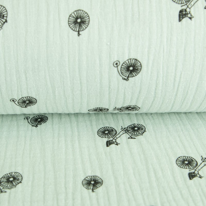 Tissu imprimé avec des petites bicyclettes sur un bambula de coton de couleur vert menthe. La bambula est un tissu très léger, fin et soutenue. Tissu pour robes, chemisiers, jupes et pantalons pour la saison printemps été. La principale caractéristique de la bambula sont ses plis qui donne la texture et le corps propre à ce tissu.