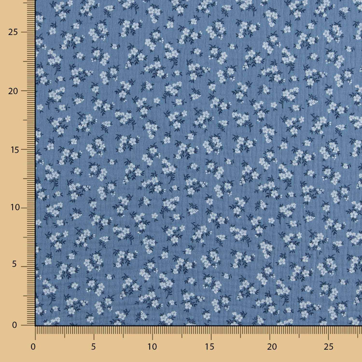 Bambula de algodón orgánico con estampado de flores bouquet marino. La bambula o doble gasa de algodón, es una tela fresca y fluida, caracterizada por los pliegues que forman la estructura y el cuerpo del tejido. Es una tela fina y opaca, por lo que no necesita ningún tipo de forro. Si buscas una tela de calidad para vestidos de verano, faldas, pantalones o camisas, sin duda la bambula de algodón cumplirá con esos requisitos.