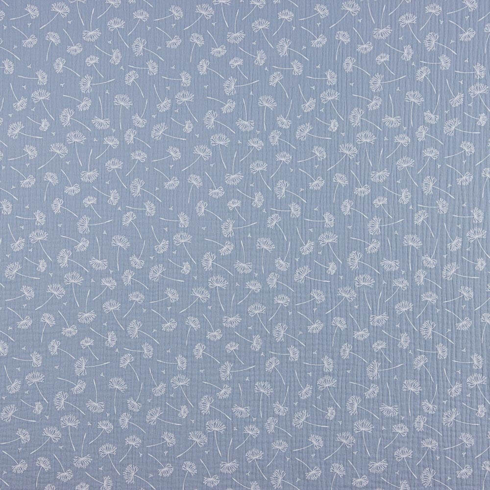 Bambula en coton biologique avec imprimé de pissenlits bleu moyen. Le bambula, ou double gaze de coton, est un tissu frais et fluide, caractérisé par les plis qui forment la structure et le corps du tissu. Il s'agit d'un tissu fin et opaque, qui ne nécessite donc aucune sorte de doublure. Si vous recherchez un tissu de qualité pour vos robes, jupes, pantalons ou chemises d'été, le coton bambula répondra certainement à ces exigences.