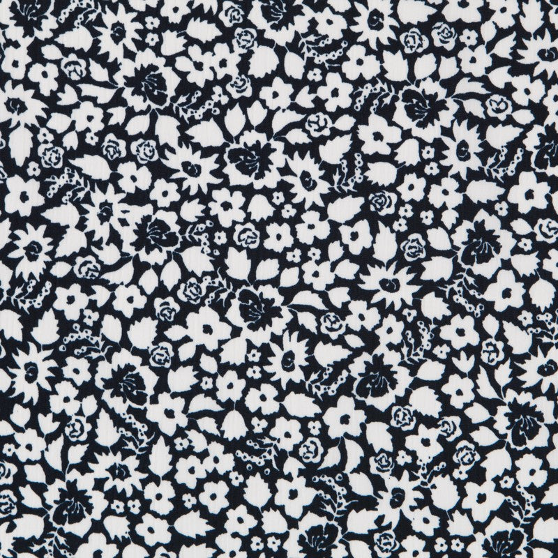 Bambula en polyester imprimé avec des fleurs sur un fond blanc. La principale caractéristiques de la bambula sont ses plis qui donnent de la texture et du corps au tissu. Tissu idéal pour coudre des chemisiers, robes d'été, jupes et pantalons.