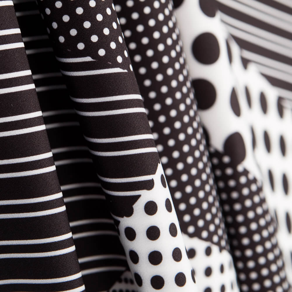 Tissu pour robes à imprimé géométrique et cols sur un tissu sergé bi-stretch. Tissu extensible de qualité, aux caractéristiques similaires au sergé mais avec plus de drapé, fluide et léger. Sergé élastique qui, grâce au pourcentage de spandex qu'il contient, offre plus de confort. Il est complètement opaque, donc il n'est pas nécessaire de faire une doublure. Tissu idéal pour les robes de soirée et les cérémonies, ainsi que pour les pantalons et jupes. Il est aussi utilisé en mode flamenco, grâce aux couleurs et fleurs typiques des robes sévillanes.