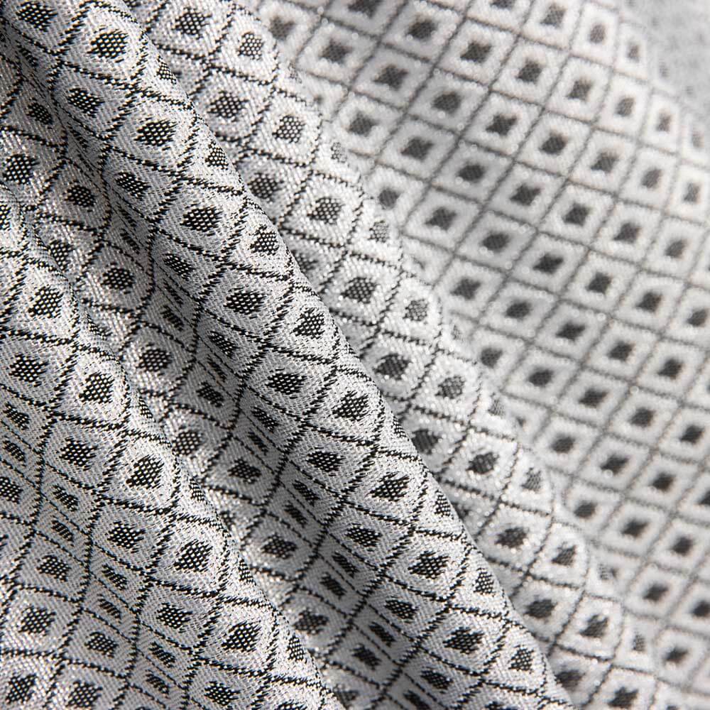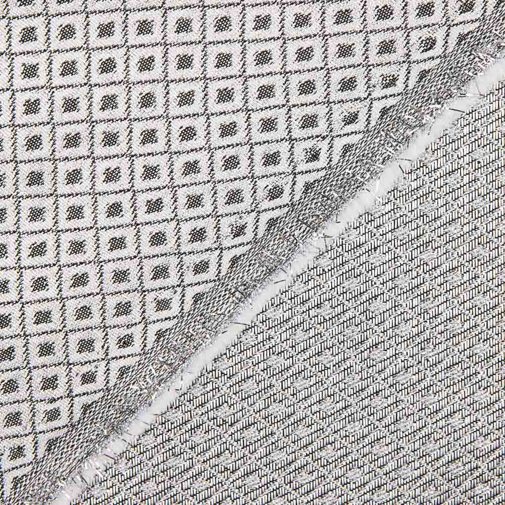 Tela Brocado lurex geométrico plata. Tela con un ligero brillo, sostenida y fina, ideal para prendas de moda, vestidos para espectáculos y ceremonia.