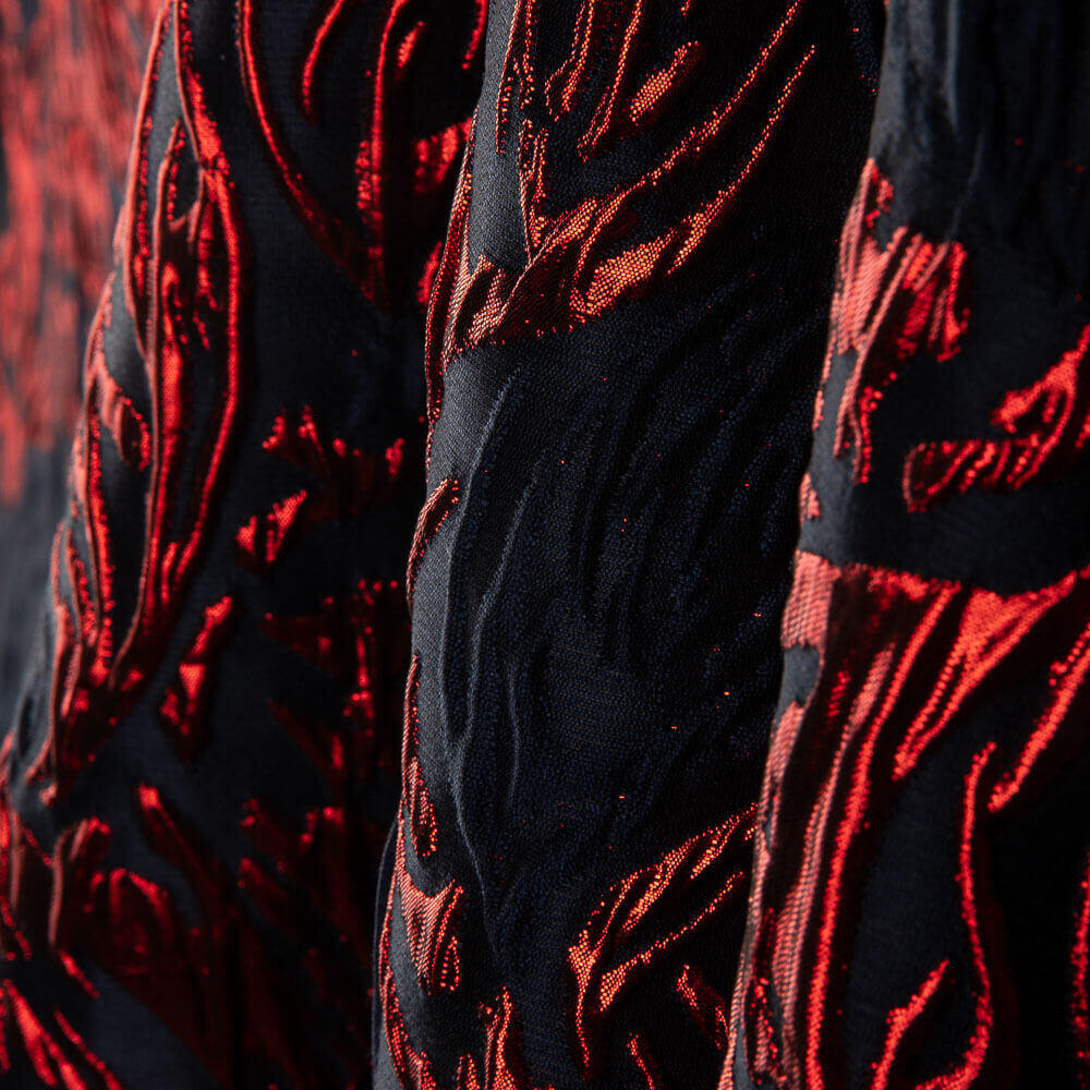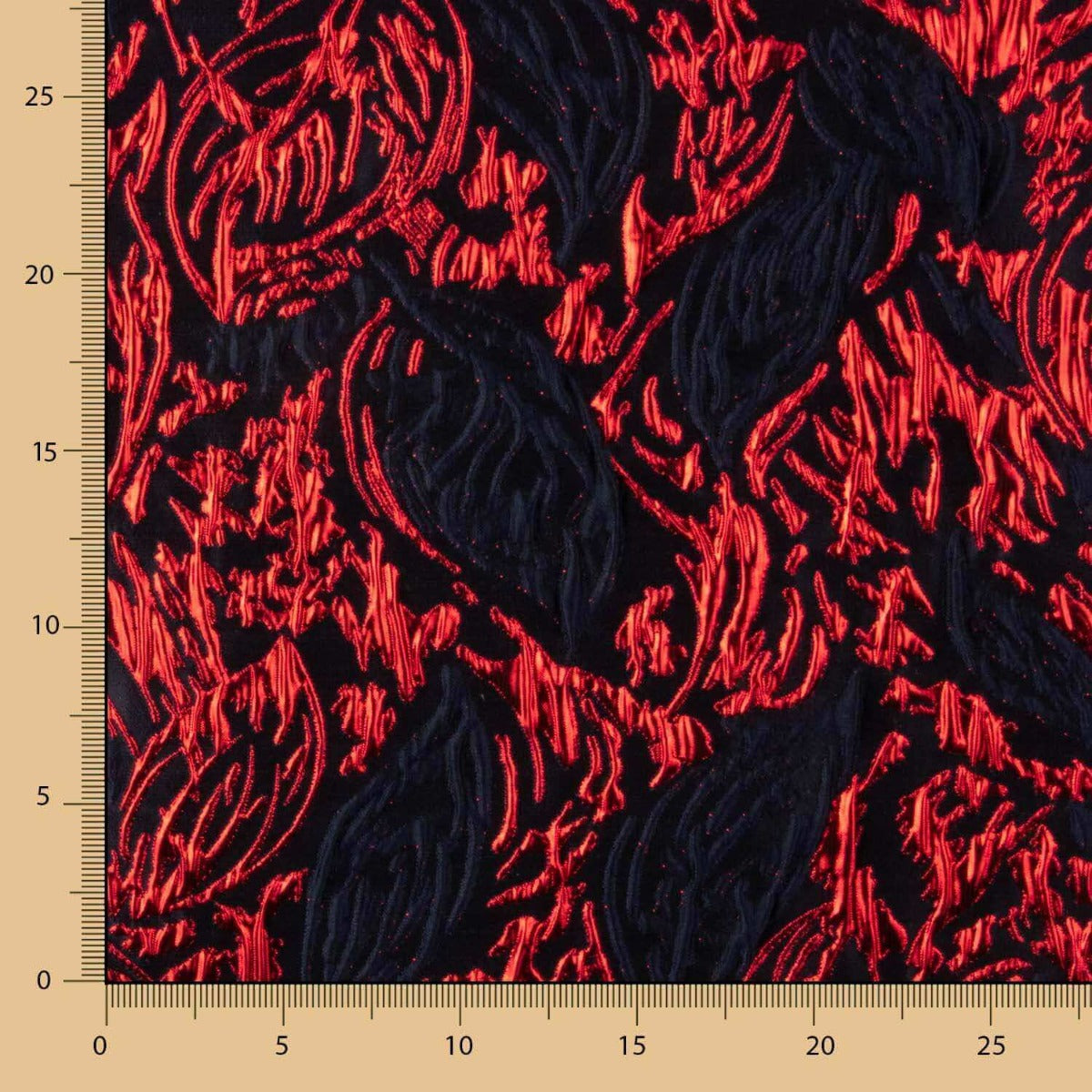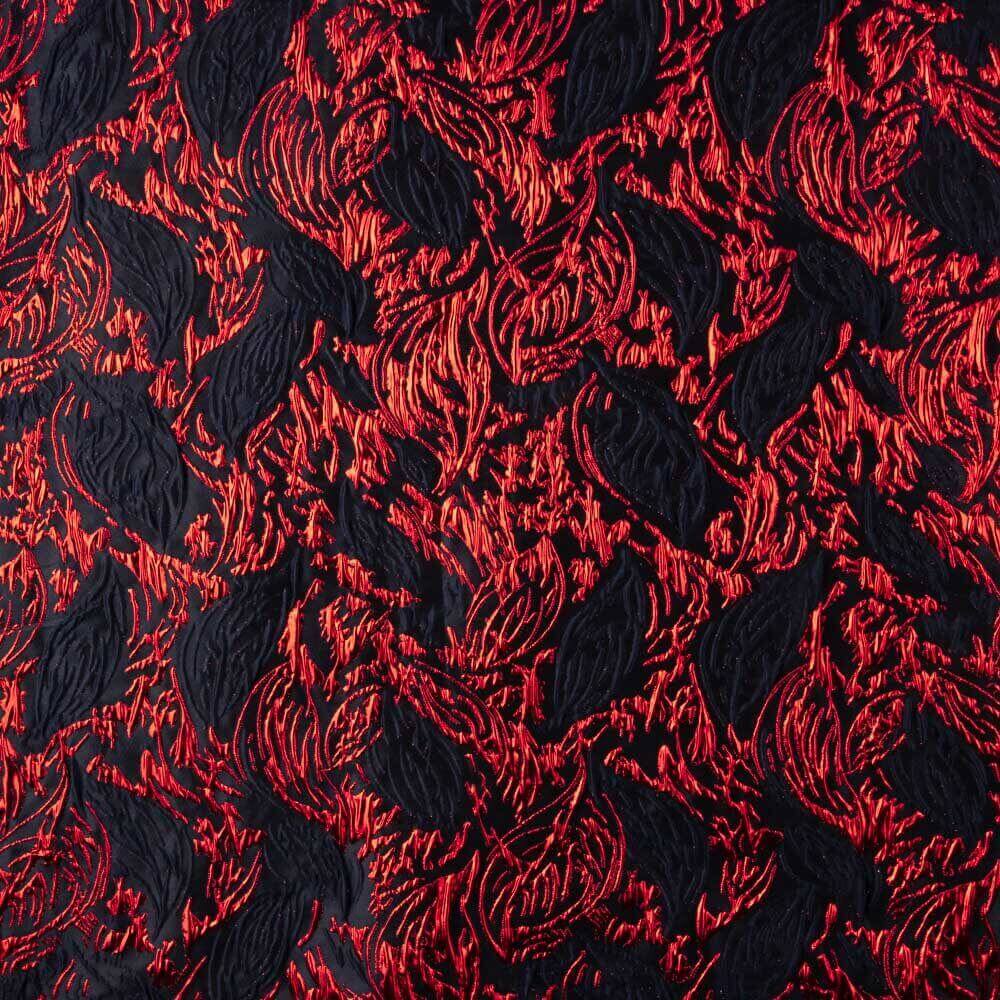 Tela brocado rojo bubble. Tela satinada tejida con hilos metálicos y de colores, aportando un brillo muy característico a la tela. Tela con brillo, sostenida y fina, ideal para prendas de moda, vestidos para espectáculos, telas para disfraces de carnaval. Además es un tejido ideal para confección de monederos, estuches, bolsos y todo tipo de marroquinería.