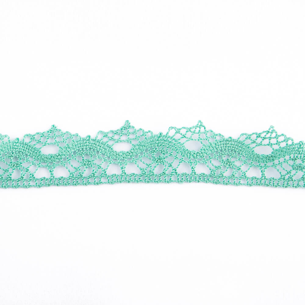 Ruban brodé verte. Ruban brodé en forme de vagues, de 3 cm de large à son point le plus large et de 2,3 cm à son point le plus étroit, toutes de la même couleur. Achetez à partir d'1 mètre. Promotion jusqu'à épuisement des stocks.