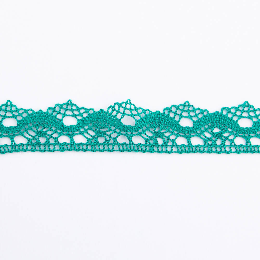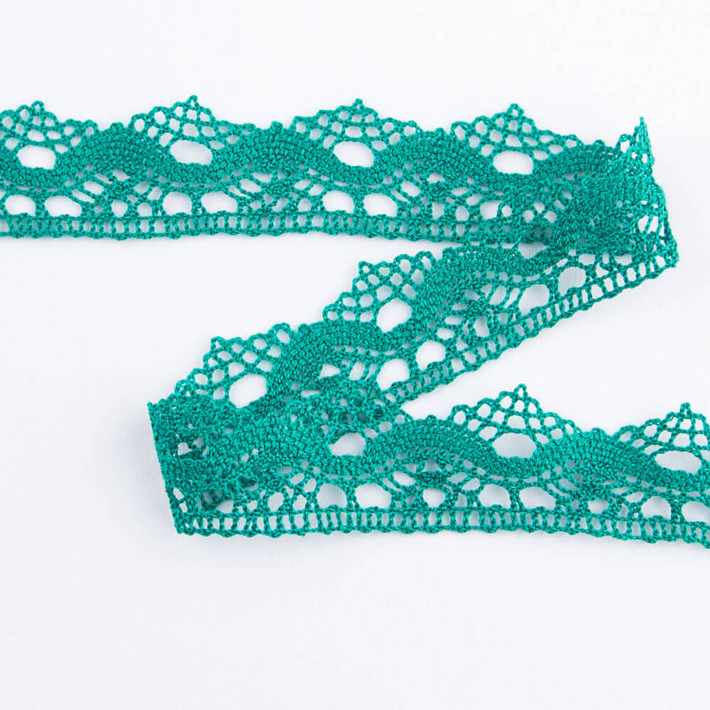 Ruban brodé verte. Ruban brodé en forme de vagues, de 3 cm de large à son point le plus large et de 2,3 cm à son point le plus étroit, toutes de la même couleur. Achetez à partir d'1 mètre. Promotion jusqu'à épuisement des stocks.