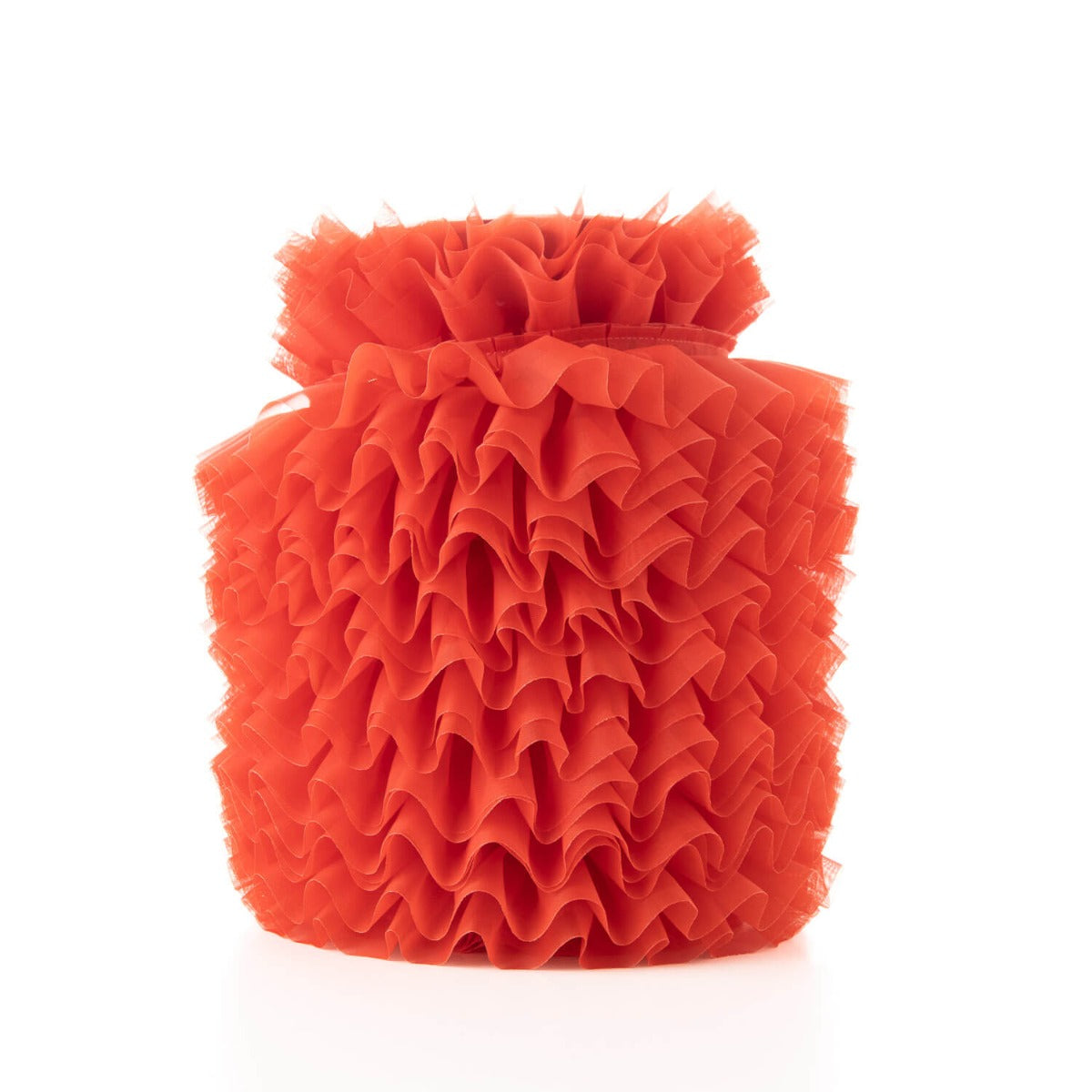 La cinta plisada garrucha en color rojo coral, (un tono rojo con ligero toque anaranjado) es un complemento ideal para realzar cualquier diseño con un toque de sofisticación.