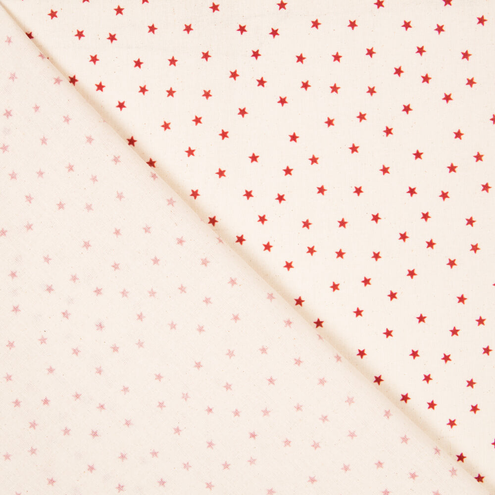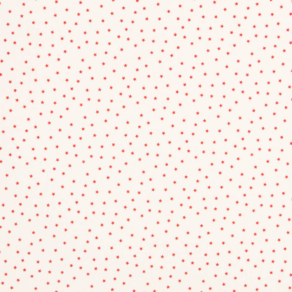 Coton imprimé avec des étoiles rouges. Tissu de coton biologique de haute qualité certifié ICEA. Popeline soutenue et douce, idéal pour la fabrication de draps, coussins, rideaux. Il est également parfait pour des accessoires, des articles de toilette, housses, sacs et pour les créations de patchwork.