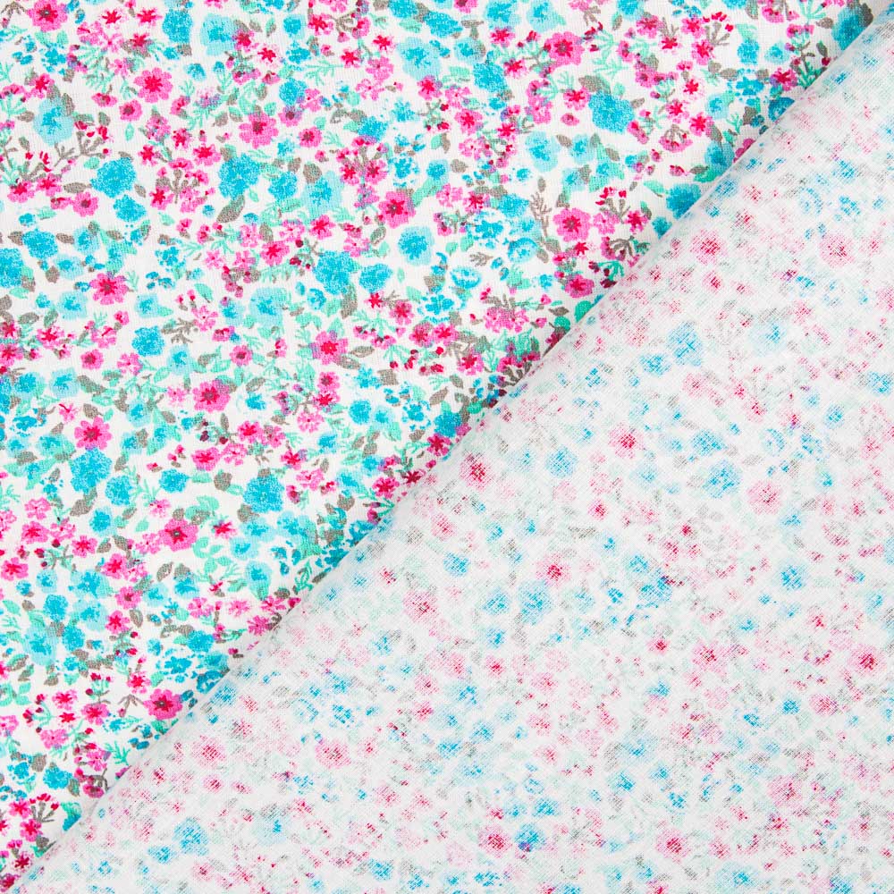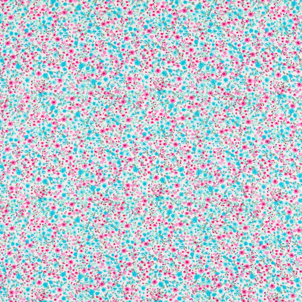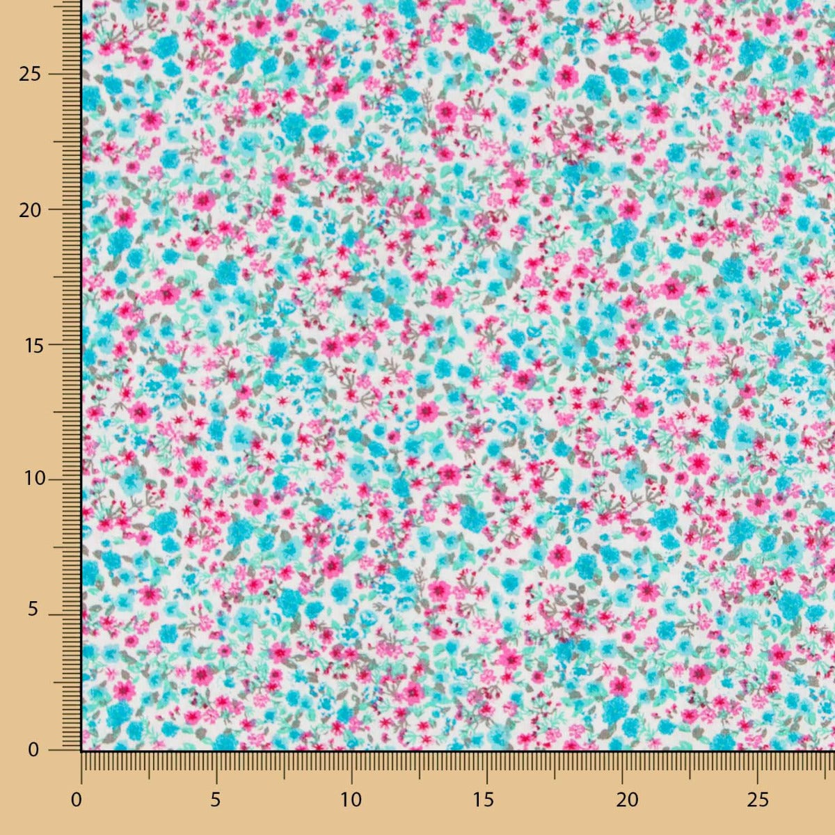 Tissu coton à fleurs fuchsias et bleues. Tissu popeline de coton, très doux, fin et résistant, parfait pour la confection de coussins, draps, patchwork et toutes sortes de décorations. Coton OEKO-TEX.