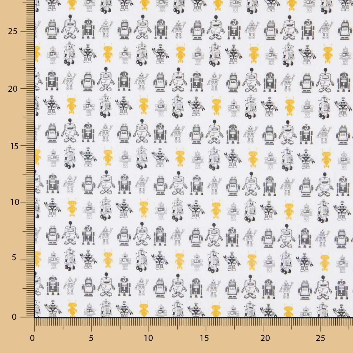 Popeline de coton imprimée de mini robots. Tissu de coton respirant, fin et très doux, caractérisé par sa grande polyvalence. La popeline est un tissu de base idéal pour fabriquer des coussins, des draps, des patchworks et des masques. Comme il s'agit d'un tissu 100% coton, il est préférable de le laver avant de le manipuler.